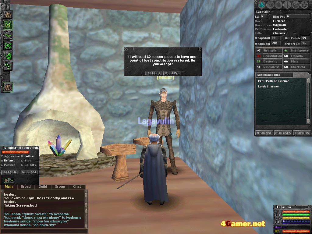 Healerの元へ行くと,予想通り1回の治療で1ポイントのConstitutionを回復してくれた。でも,治療には結構なお金がかかるのだ。しかもレベルに応じて値段は高くなっていくようで,今後高レベルになったら相当な額をふっかけられそうな感じだ。まったくをもって,ぼったくりな医者である。