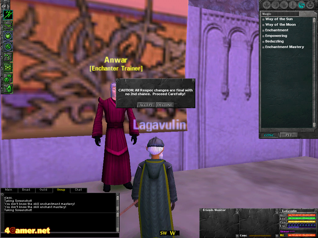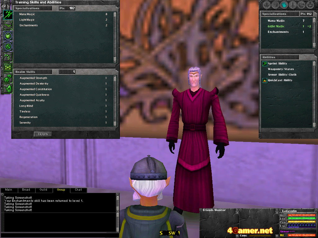 DAoCではキャラクターが成長すると,レベル×一定数値(職業によって異なる。Enchanterは1)のSpecialize Point(以下SP)が入り,それをスキルに割り振ることで新しい攻撃方法や魔法を修得できる(レベルに応じて自動で覚えるモノもある)。この割り振りは首都などにいるTrainer(師匠)に話しかける(右クリック)ことで行えて,あるスキルをレベル2に上げるには2ポイントのSPを,3に上げるには3ポイントのSPを消費する。