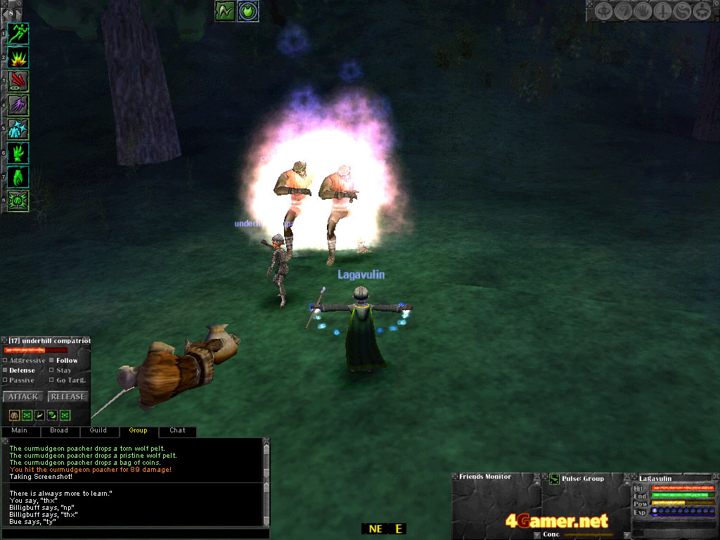 というわけで早速試し撃ちしてみよう。クリックすると表示が青いヤツ(自分と対等程度)を3体相手に戦ってみた。作戦は簡単だ。ペットをモンスターに突撃させ。しばらく戦わせる。そのときに今回覚えたペット用のダメージシールドを使っておくと敵の攻撃を反射するので,敵全員にまんべんなくダメージが与えられる。あとは頃合いを見計らって,先ほど覚えた爆発魔法を連射するだけ。万が一モンスターがペットを無視してこちらに来てしまった場合は,Quickcast(このスキル使用後に唱える魔法は詠唱が止まらない)でさらに爆発。
