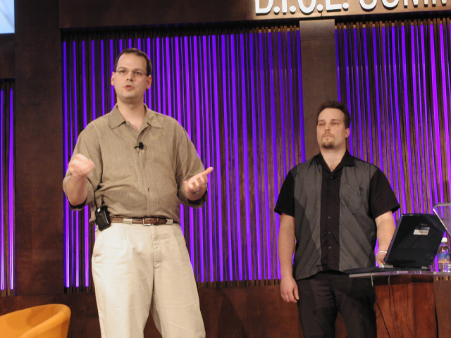 ゲームデザイナー達のサミットD.I.C.E. 2003の2日めも,ラスベガスでは珍しい雨の中で進行した。もちろん会場は屋内なので心配ないのだが,この3日間で1年分という激しい雨量だったらしく,会場の通路のアチコチには,雨漏りを受け止めるためのバケツが置いてあった。また昨晩のパーティで飲みすぎたのか,そのバケツの周囲でコーヒーをすする起き抜けのゲーム業界関係者達がとてつもなくだるそうに見えたのは,筆者だけではあるまい。