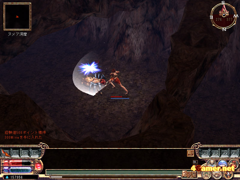 ビギナーゾーンのときのように,ひたすらモンスターを倒し続けていると,先週ムダにしてしまったお金(Mina)を記憶の彼方に追いやれるほどの所持金になってきた。Minaの使い道は,ザリガニを買うだけではない。ヌメアの村を探索していたときに「倉庫」というのを発見したが,利用するには前金で25万Mina(!)を渡さないとダメらしいのだ。それまでのモンスターから得るMinaとザリガニ代との収支差ではあまり所持金が増えないので,まだかなり先のことだと思っていた。しかし,ここでレベルアップを繰り返しているうちに(ほかのプレイヤーが置いていったアイテムもこっそりゲットした),あれよあれよという間にMinaが増えていき,ついに23万Minaに! 「フフフ,倉庫に荷物が置けるようになったら,あれもこれも置いておけるな……」などとひそかに野望を持ちつつ,あと2万Minaを稼ぎにGo!