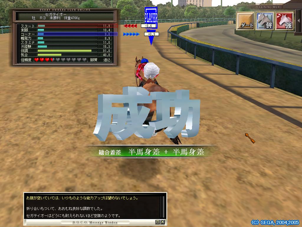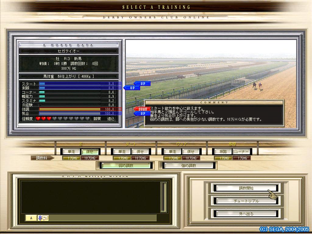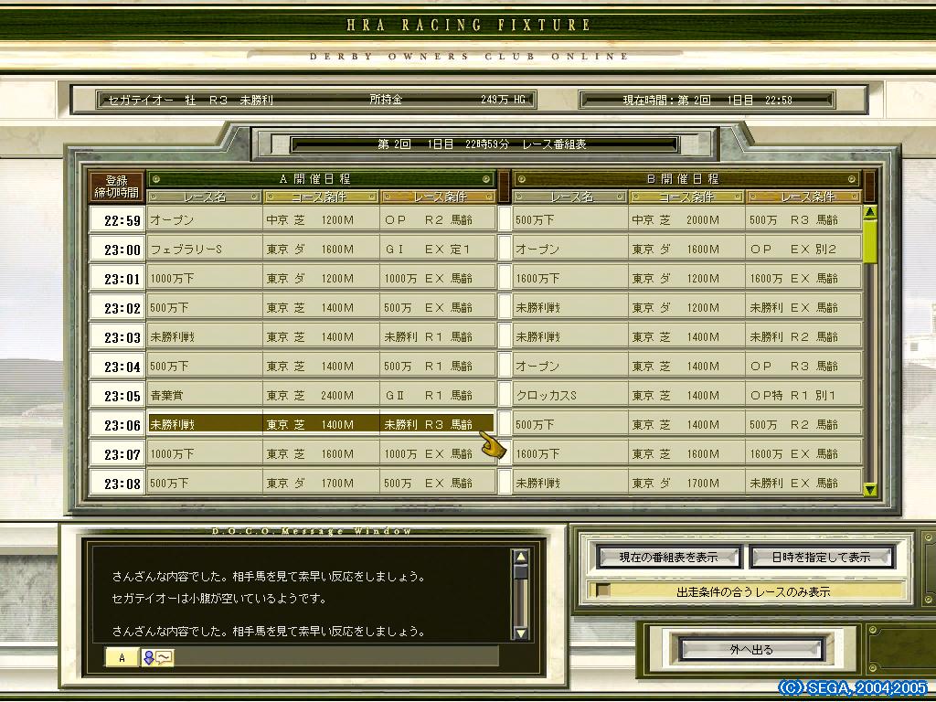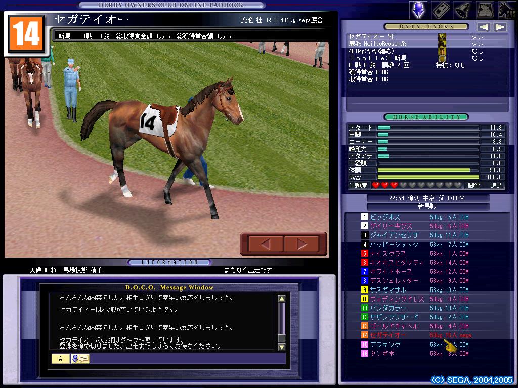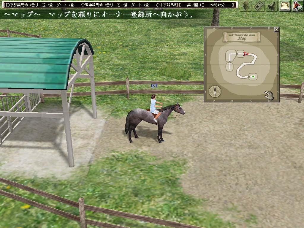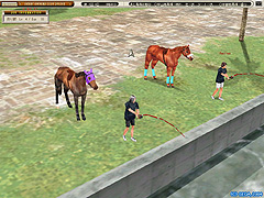 ある程度調教に慣れて自信がついたら,いよいよレースに出走だ。競馬場に行って,愛馬の条件にあったレース(最初は新馬戦か未勝利戦)をクリックして,登録されるのを待とう。ほかのプレイヤーの登録,あるいはプレイヤーが少ないときはコンピュータが用意した馬を交えてレースが始まる。