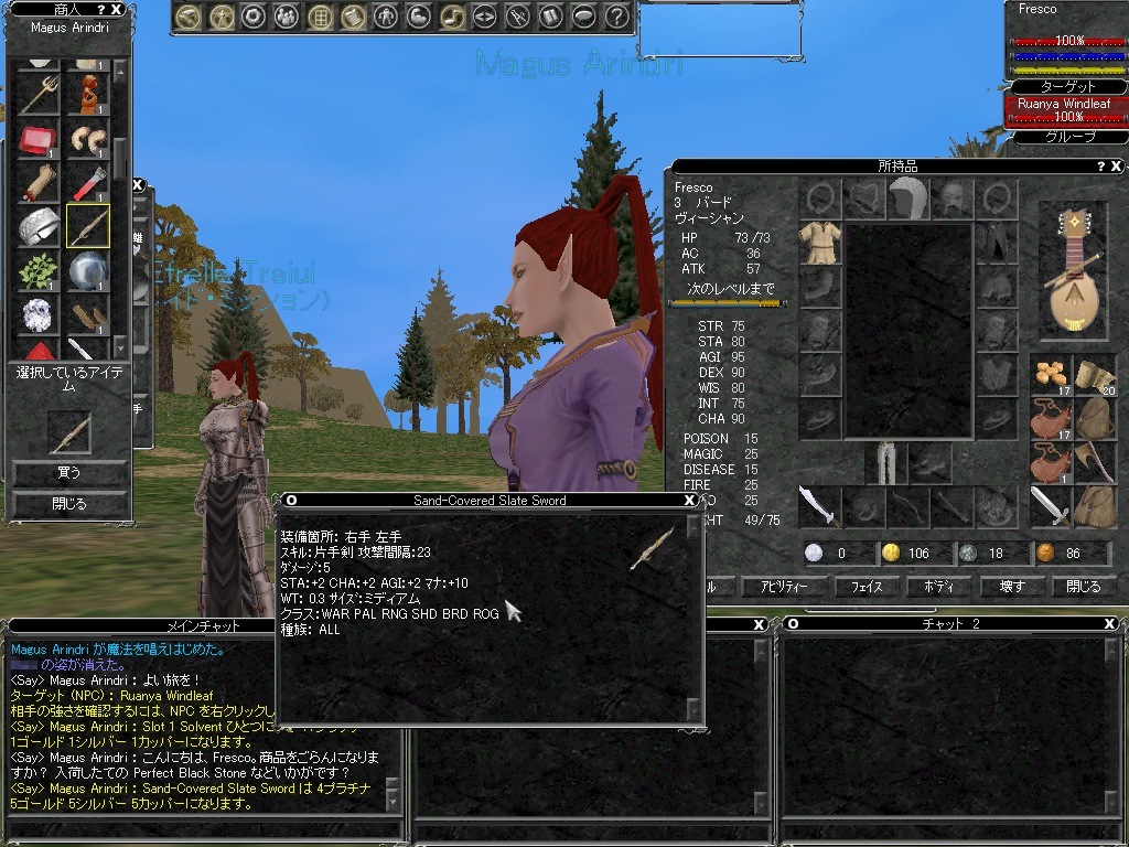 初心者エリアで,たまに同じレベルの人を見かけるかもしれないが,多くは現役プレイヤーのAltキャラクターとかで,豪華な装備をしていることも多いだろう。新規ユーザーとは格段の差がある。そういうのと同じは無理としても,なるべくよい装備を揃えるのがEQの基本である。装備が少し揃えば狩りもずっと楽になる。じっくりやるのも悪くないが,サクサク狩りをしたほうが楽しい。
