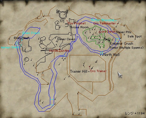 これがほぼ全体図だ。狩り場としては,いくつか伝統的な分け方がある。 CCBからの洞窟(南端)から目の前の庭と川向こうあたりの見渡せる場所,西側に渡ってOrcの洞窟とその前庭近辺,東端のSlaverとTaskmaster,Orc城周辺と入り口の橋の前,城内(Throne Room),さらにEmperor CrushのいるTower,入り口近くの丘(見た目的には壁の上ないし山の上) Trainer Hill,そして北の奥にあるOrc Campである。