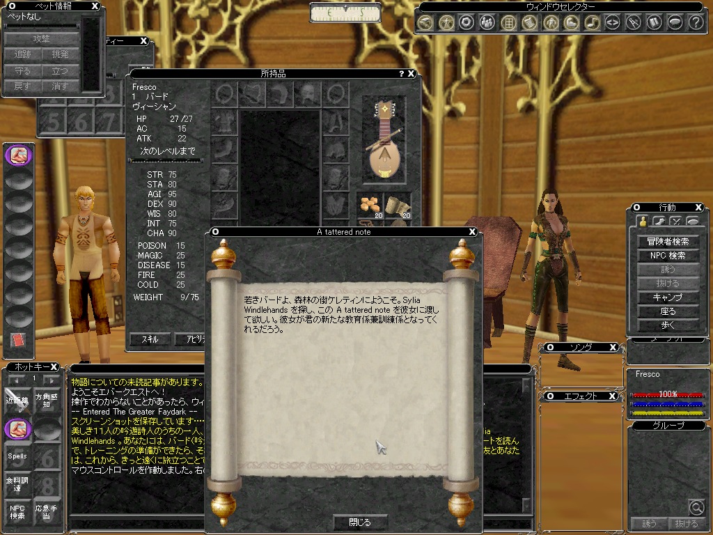 | 持ち物にあるノートを右クリックで読むと最初のクエストが書かれている | さて,ゲームを開始すると,あなたは,どこかよく分からない建物内でよく分からない人たちに囲まれているはずだ。そこがあなたの所属するクラスのギルドホールだ。レベルアップしたときには,そこにいるGM(ギルドマスター。ゲームマスターのGMとは別)にスキルのトレーニングをしてもらったりする。魔法なども売っている場所だ。