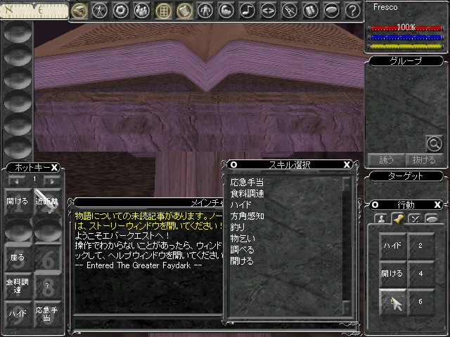 行動ウィンドウのタブを開いていくと,空欄がたくさん並んでいることと思う。空欄を右クリックすると,そこに割り当てるスキルが選択できる。すでにいくつかのスキルが並んでいるはずだ。それを使用可能にしておこう。また,ここでボタンに割り当てたスキルは,そのボタンを長めにクリックすることで場所の移動ができるようになる。よく使いそうなものはホットキーに割り当てておこう。