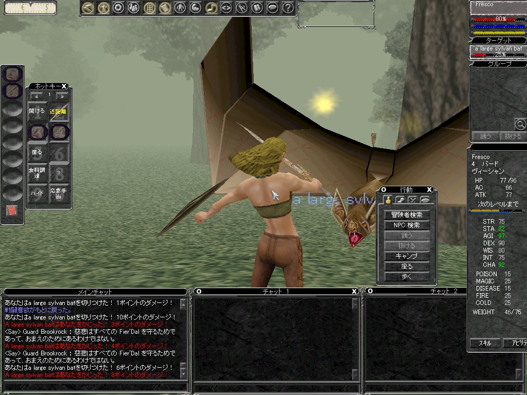 Mobをクリックしてターゲットし,近づいて近接戦闘ボタン(またはデフォルトショートカットだとフルキー側の1またはQ)を押すと,殴り合いの戦闘が開始される。Meleeもキャスターも最初は殴り攻撃必須なので,適度に殴りあいもやっておこう。防御スキルは,殴り合いの過程でしか上昇しない。最終的には殴られないようにするテクニックが重要になるのだが,殴られたときのためにも防御スキルを上げることは大切だ。