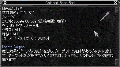 | これが死体探し用アイテムだ | さて,戦闘を続けていれば,そのうち必ず死ぬことになるだろう。レベル10以下では,死体回収なども不要なので気にしない人が多いと思うが,やがて死ぬとなんの装備もなしにバインドポイントに放り出されることになる。そうなれば死体回収が必須となってくる。