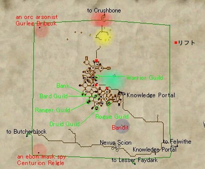 GFayへの移動は,各地のPoKポータルをクリックしてPoKに移動し,FelwitheないしKelethinストーンから移動できる。故郷の周辺でレベルを上げるのもよいが,定番スポットなので以下,GFayを中心に初心者エリアを紹介していくことにする。