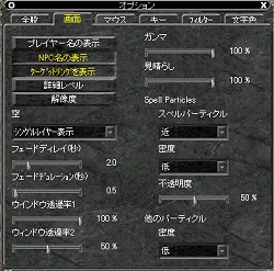 パーティクルがあると,どのような魔法がかけられているのか目で確認できて便利だが,Brdなどがいるとあっというまに画面が光で埋まったり,スペルの黒煙で戦況の把握も難しくなったりもするのでOFFにしておくのが無難か。