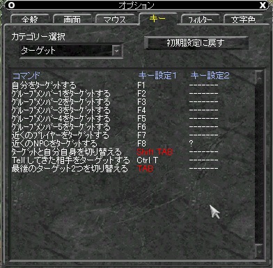 Tabキーの機能も書き換えよう。デフォルトでは,Tabキーを押すごとに自分と最後のターゲットを切り替えるが,自分に対してターゲットを行うことはさほど多くない。行う場合は自然にF1キーを押すように身体ができあがっていくはずなので,Tabキーは無駄である。この部分は最終2ターゲットの切り替えに変更できる。