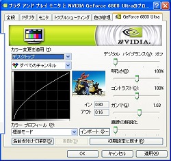 さらに現状のDirectX8ベースのクライアントでは,DirectX9を入れてしまうとオプションでのガンマ調整がきかなくなってしまう。そこで,画面のプロパティなどから,ビデオカードの色補正機能を使ってガンマを高めに設定しておくことになる。夜目の利かない種族(ヒューマンやバーバリアンなど)の場合は,暗いところに行くとほとんど周りが見えなくなるので,1.4〜1.6あたりでガンマを高めに設定しておこう(各自の使用しているディスプレイによる)。