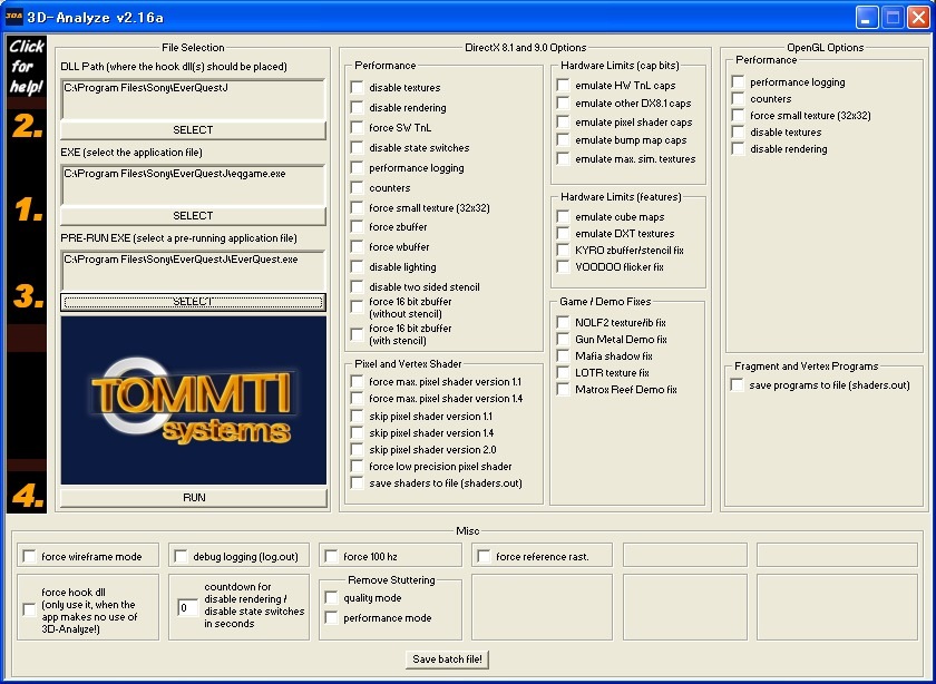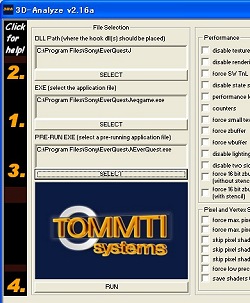 まず,3D-Analyzerを起動して,横に「1.」と書いてある欄に実行ファイルeqgame.exeを指定する。デフォルトインストールであれば,C:\ Program Files\ Sony\ EverQuestJに入っている。