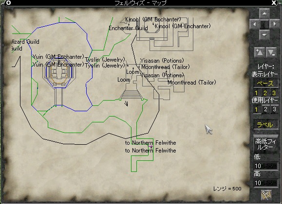 インストールしたら,なにも考えず,eq.mapfiend.netの 「ここ」 からMapPackをダウンロードしてこよう。「Sony format 」を選択して,とりあえず全部ダウンロード。ファイルを展開して,中にあるテキストファイルをまとめて,EQをインストールしたディレクトリ(デフォルトだとC:\ Program Files\ Sony\ EverQuestJ)にあるmapsフォルダに入れてしまおう。既存ファイルは上書きでOkだ。 これは公式にサポートされているデータではないが,もともとこのマップシステムは,ユーザーがデータを作成していくように作られている。 万一不具合があったとしても文句はいわないように。実際,ときどき間違ったマップや不完全なマップもあるのだが, それでも便利に使えるデータであることは間違いない。