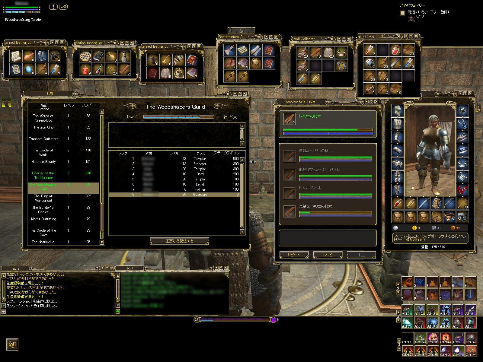 | 自分がどの工房に所属しているかは,工房ウィンドウで確認できる。ウィンドウには属している工房が,緑色で表示される。工房を退会するときは色を頼りにすればよく,また同じ工房にほかのどんなプレイヤーキャラクターが所属しているかなども分かる |