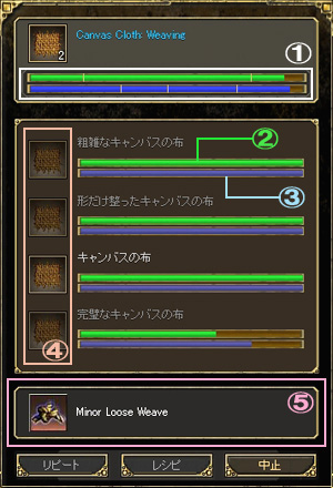 作業に取りかかるとレシピウィンドウが切り替わる。生産中のウィンドウは,緑色のバーが素材の耐久度(ヒットポイント),青色のバーが作業工程の進行具合となる。生産はこの二つのバーをバランスよく進行させ,素材の耐久度を下げることなく,より良いアイテムを作っていくことが目標となる。