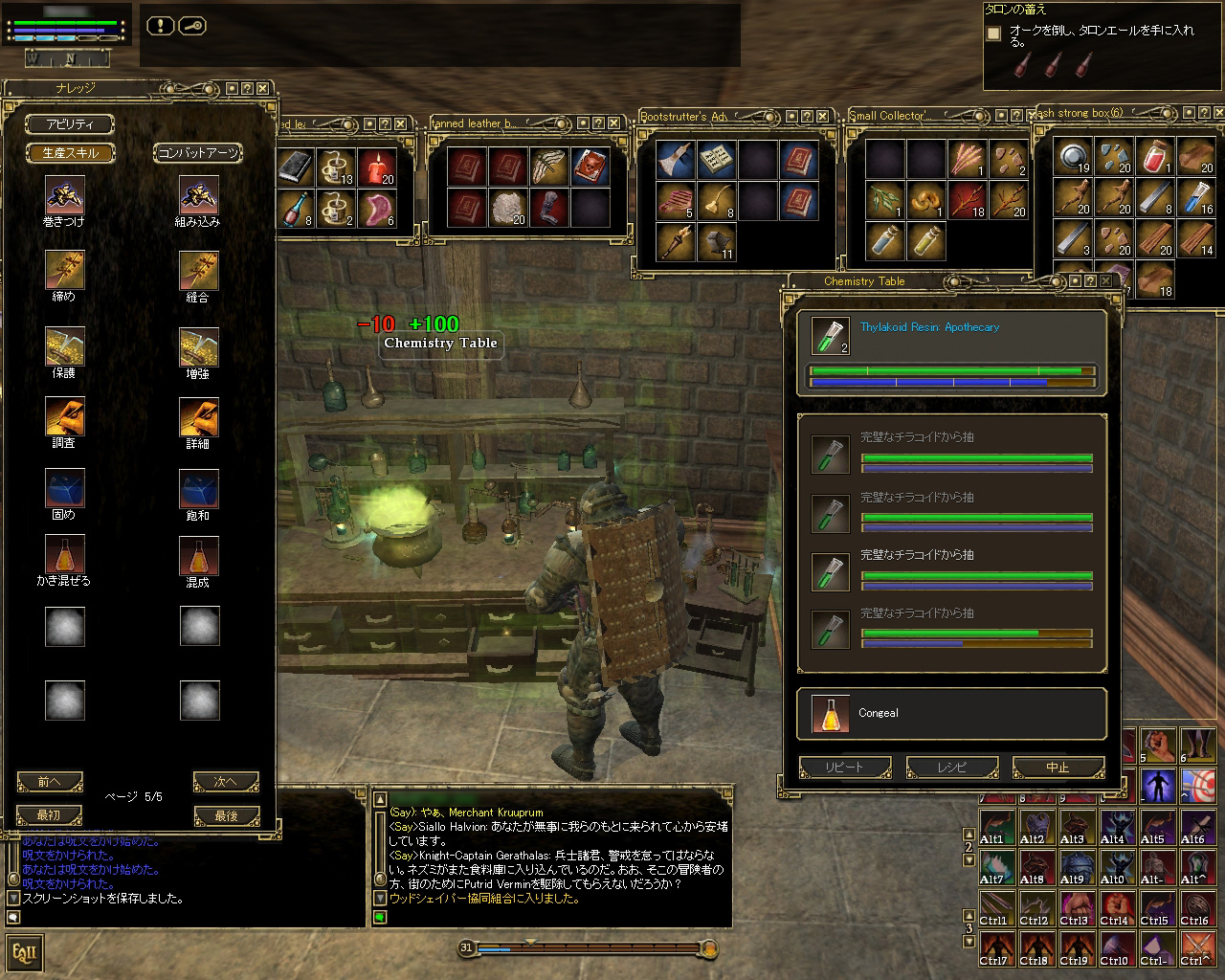 日本語版では,すでに共通するナレッジは導入されており,このナレッジを使うことで,誰でも完成品を作成できるようになっている。なお,これらのナレッジは「薬学 基礎編 第1巻」(テクニックは調合術)「地質学 基礎編 第2巻」(古代の知識)「木材加工 基礎編 第3巻」(ウッドクラフト)といったレシピブックから習得でき,基礎工房のNPCから購入可能だ。