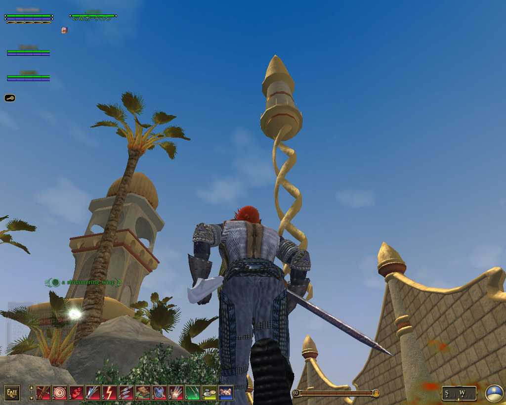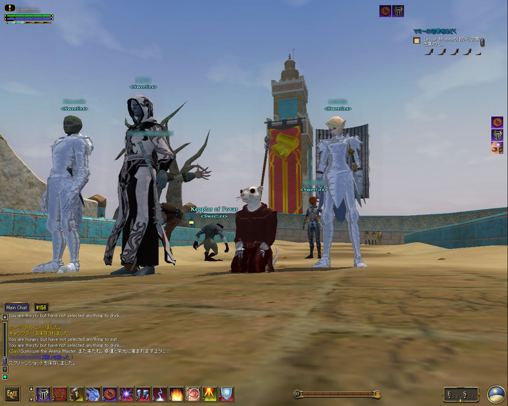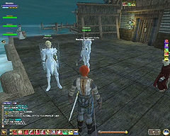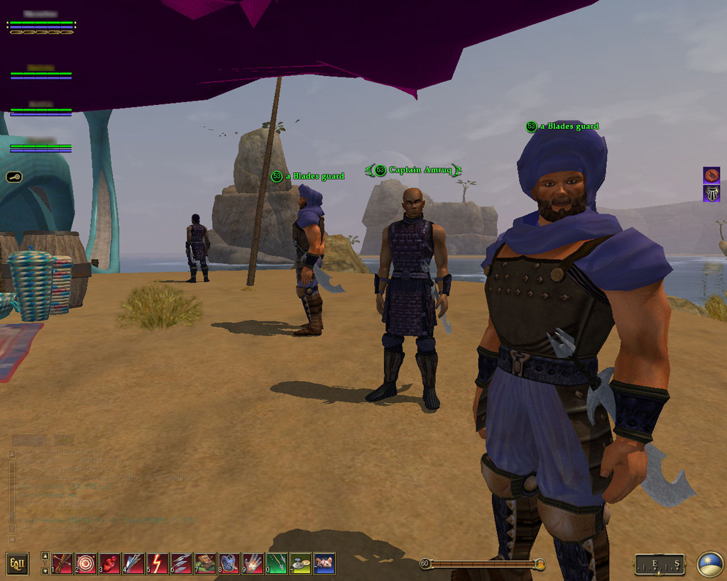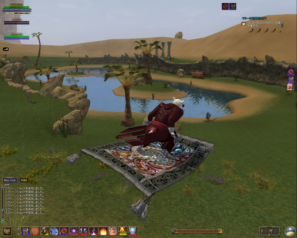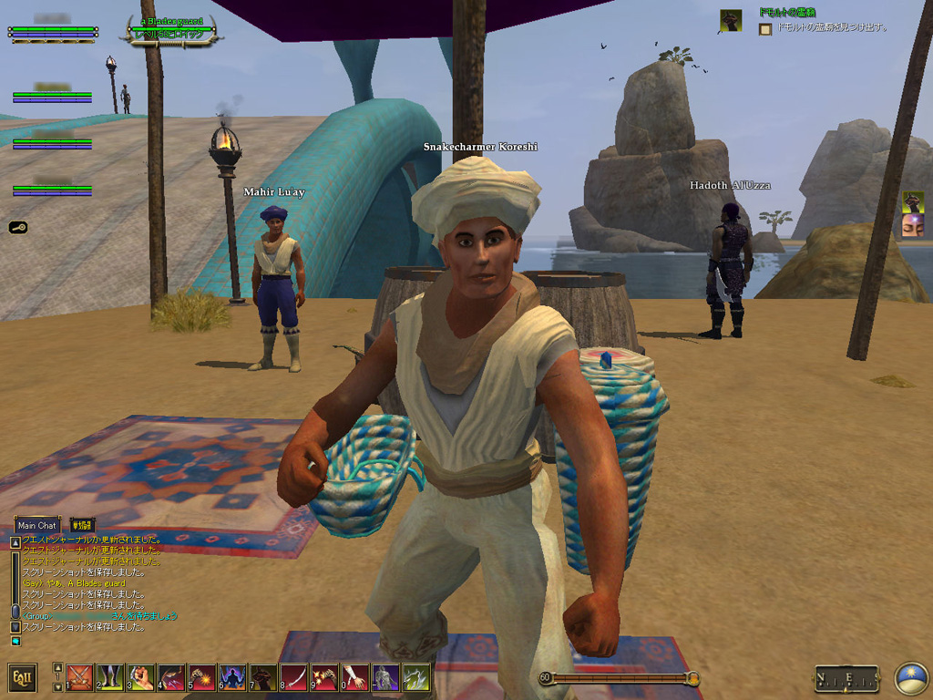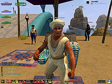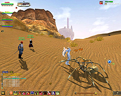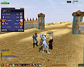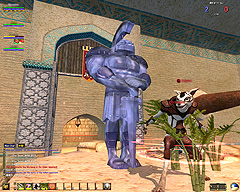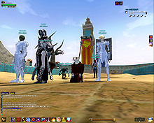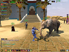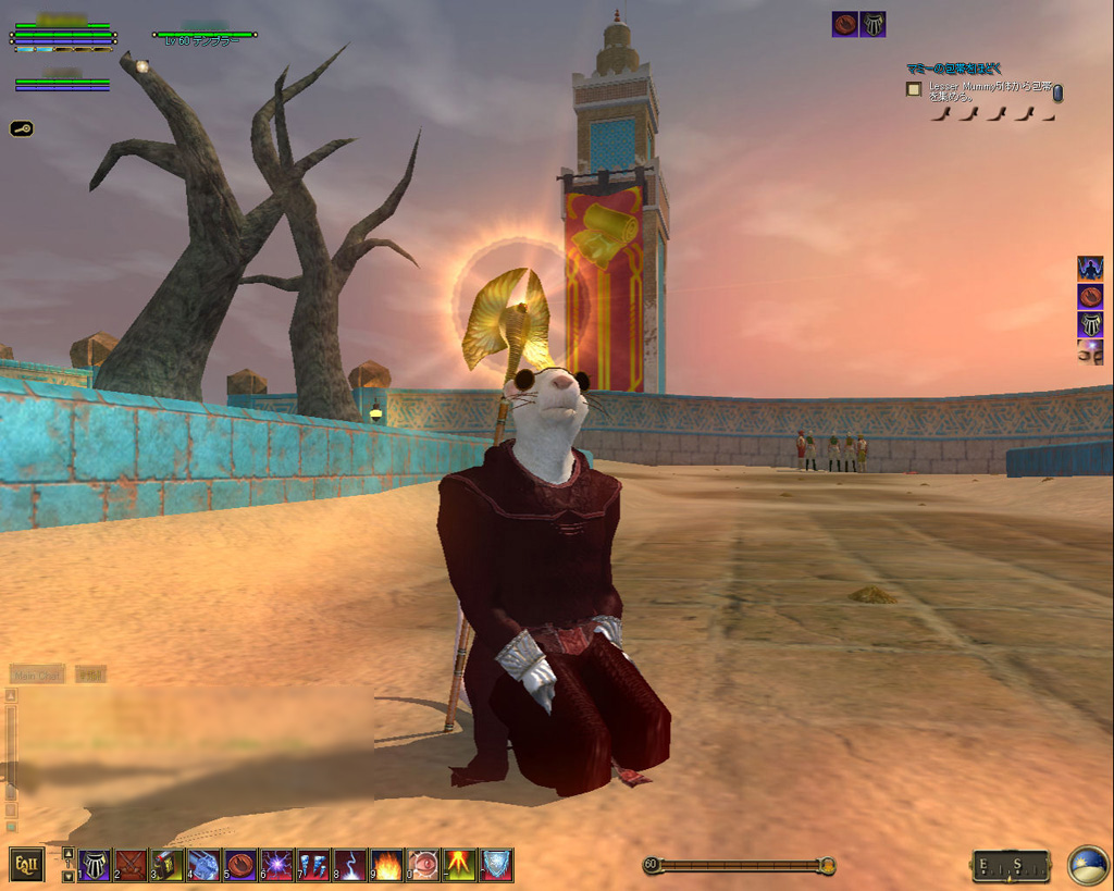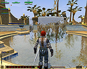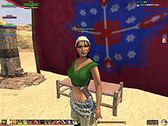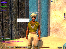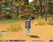 このテントには,さまざまな勢力のNPCが並んでいた。この世界へ新たに訪れる冒険者の勧誘合戦はもう始まっている,といった風情だ。ガイドの先導で進んでいくと,画面上にいま入った地域名が表示される。「マーのオアシス」! 前作「エバークエスト」(以下,EQ1)の経験者であればアレやコレやいろんなものを思い出さずにはいられない地名だ。この古い友人に久しぶりに出会えたような感覚が嬉しい。