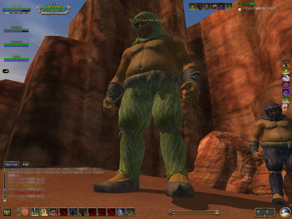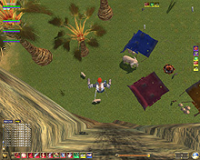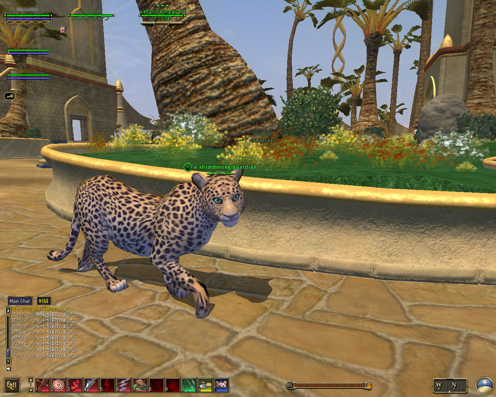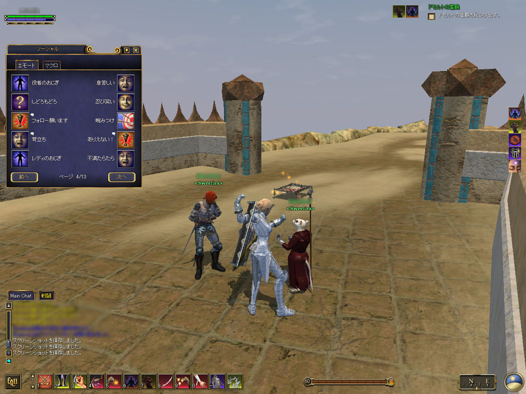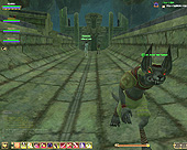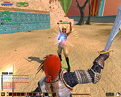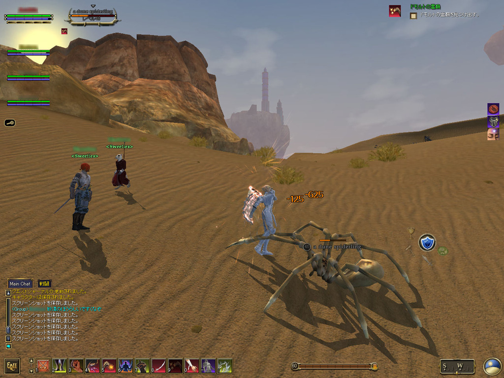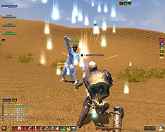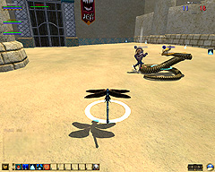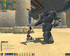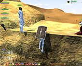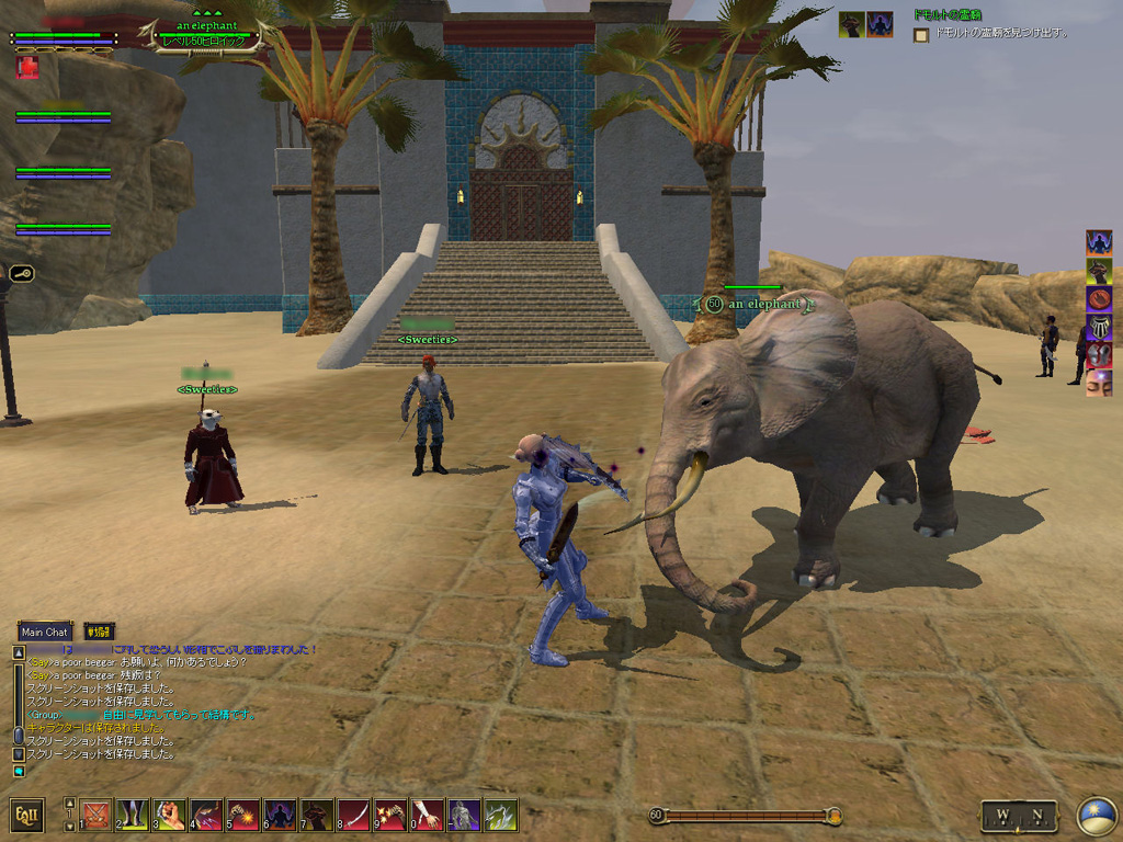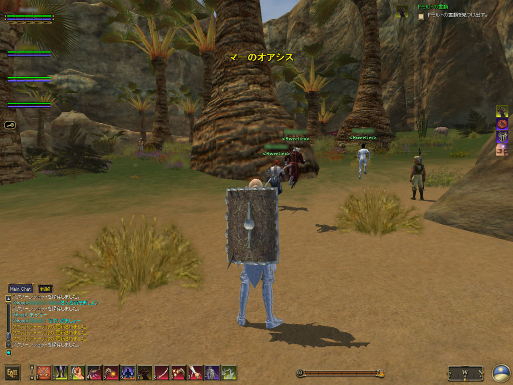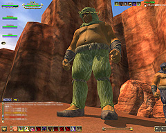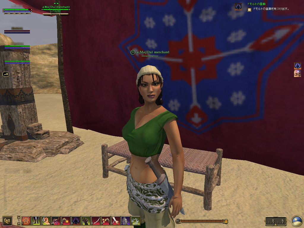 このテントには,さまざまな勢力のNPCが並んでいた。この世界へ新たに訪れる冒険者の勧誘合戦はもう始まっている,といった風情だ。ガイドの先導で進んでいくと,画面上にいま入った地域名が表示される。「マーのオアシス」! 前作「エバークエスト」(以下,EQ1)の経験者であればアレやコレやいろんなものを思い出さずにはいられない地名だ。この古い友人に久しぶりに出会えたような感覚が嬉しい。