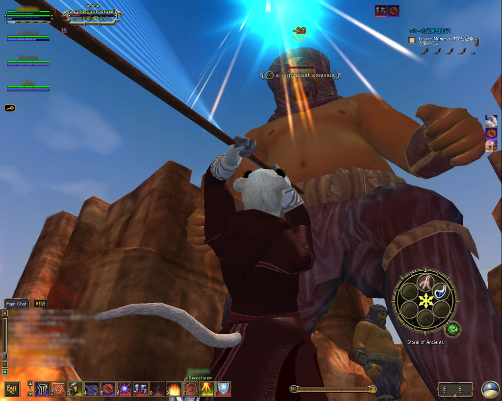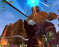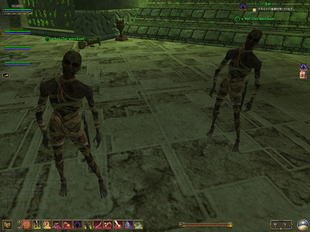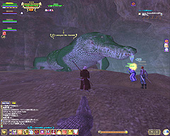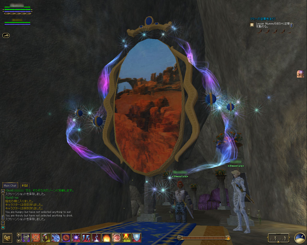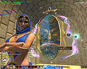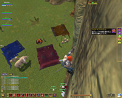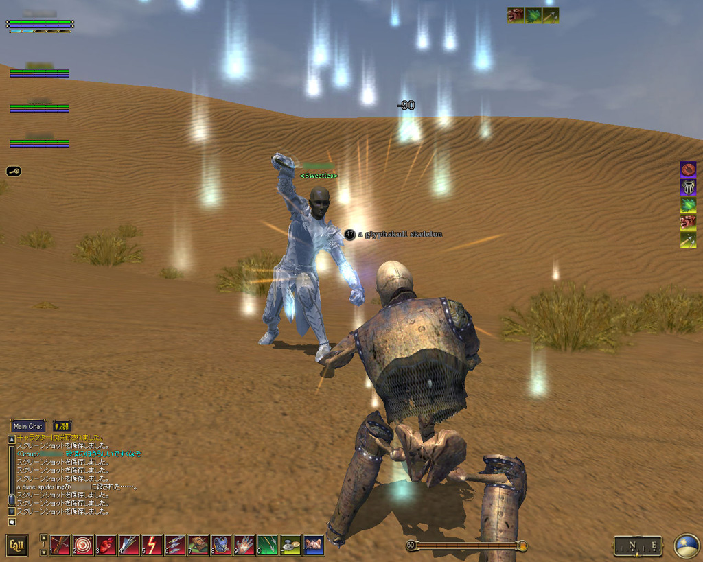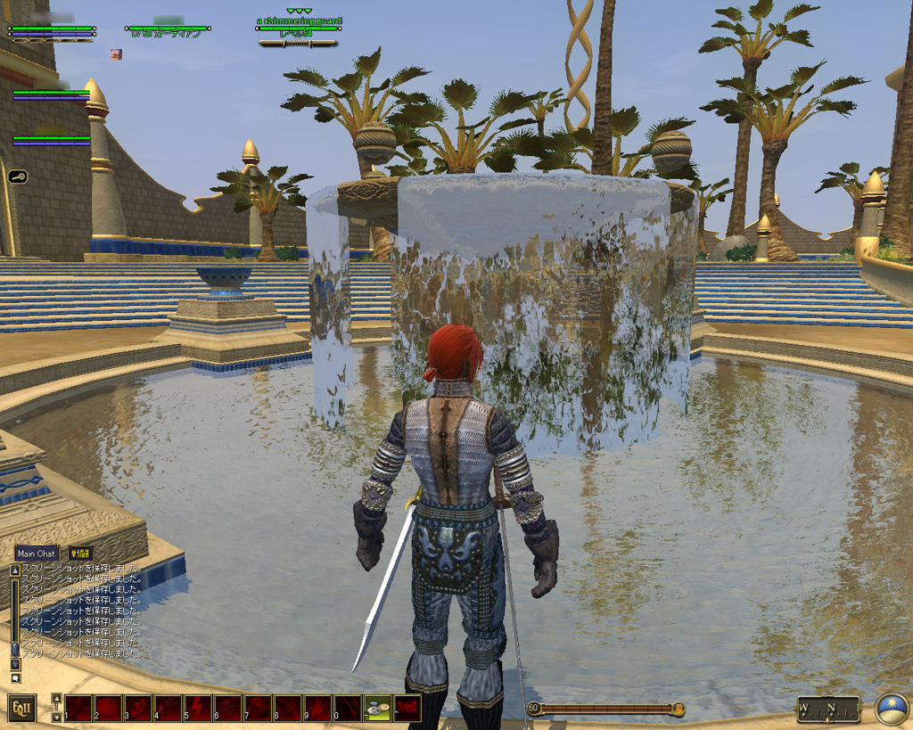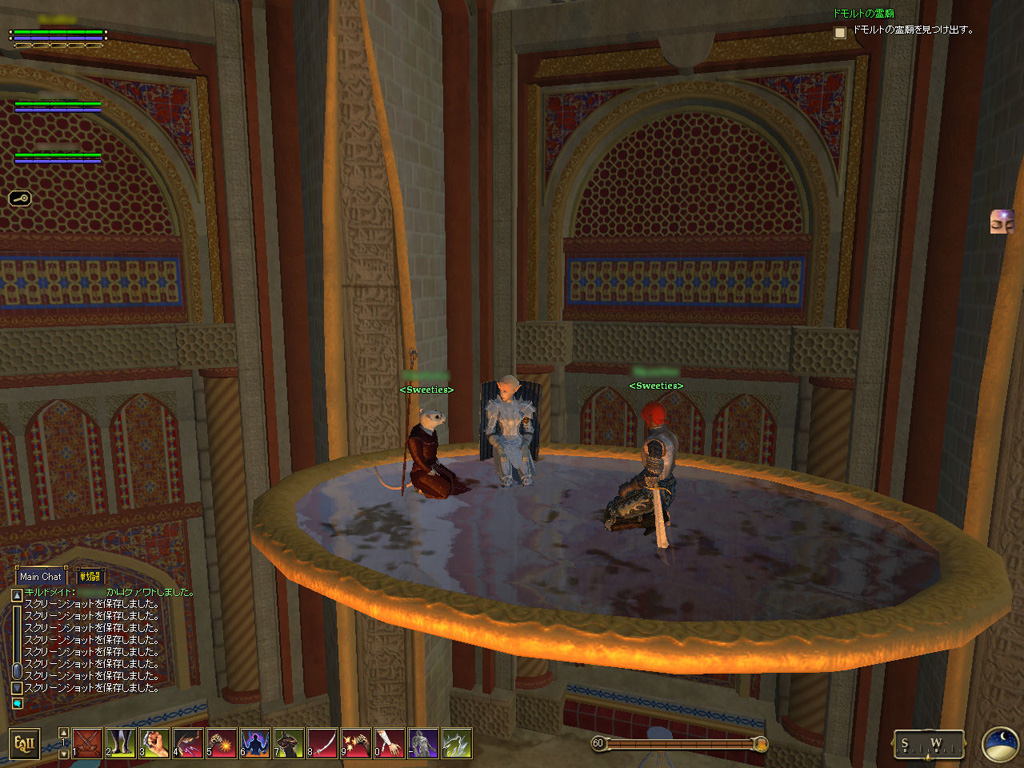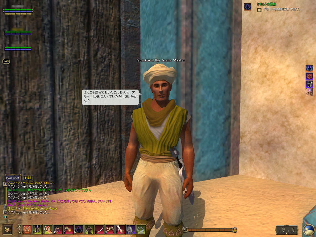このテントには,さまざまな勢力のNPCが並んでいた。この世界へ新たに訪れる冒険者の勧誘合戦はもう始まっている,といった風情だ。ガイドの先導で進んでいくと,画面上にいま入った地域名が表示される。「マーのオアシス」! 前作「エバークエスト」(以下,EQ1)の経験者であればアレやコレやいろんなものを思い出さずにはいられない地名だ。この古い友人に久しぶりに出会えたような感覚が嬉しい。