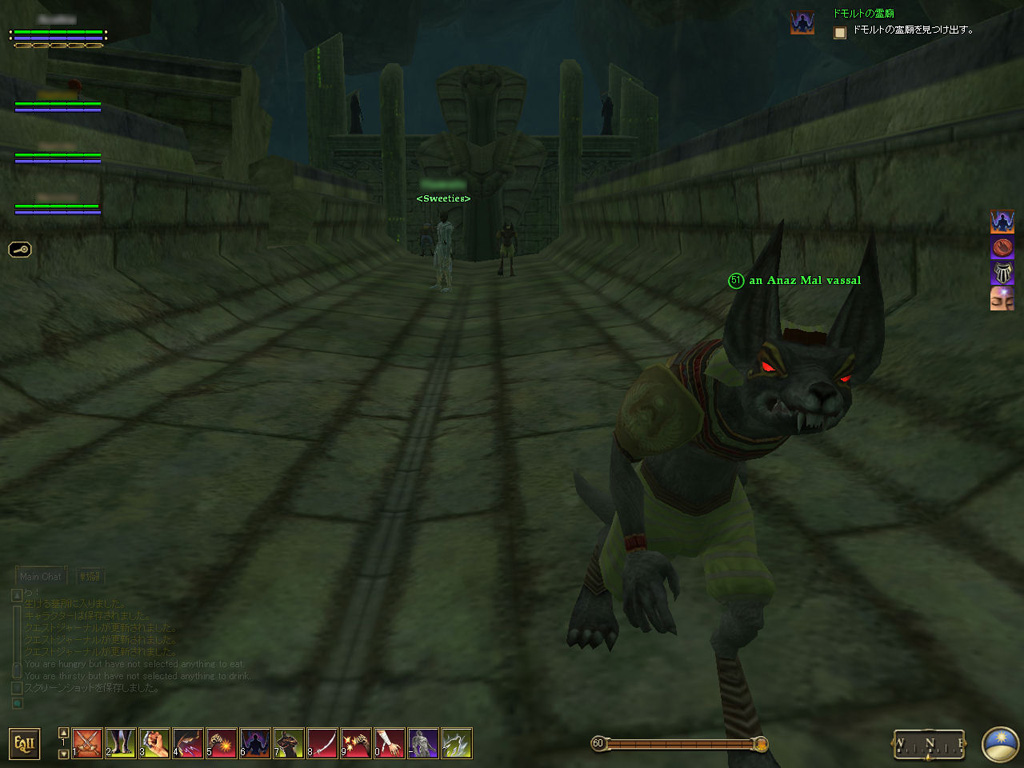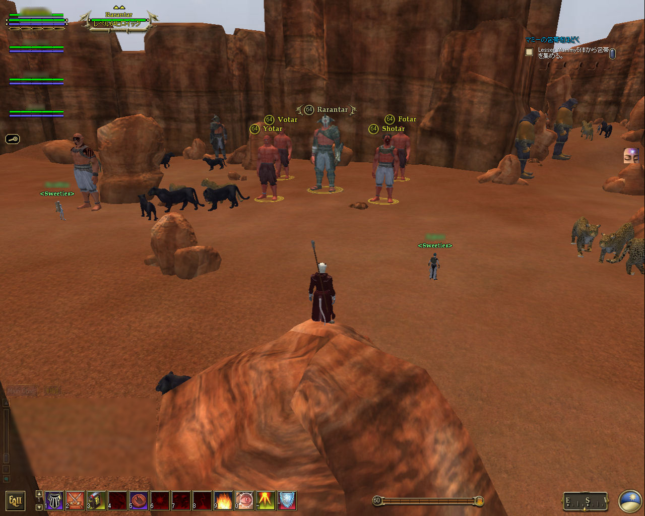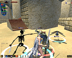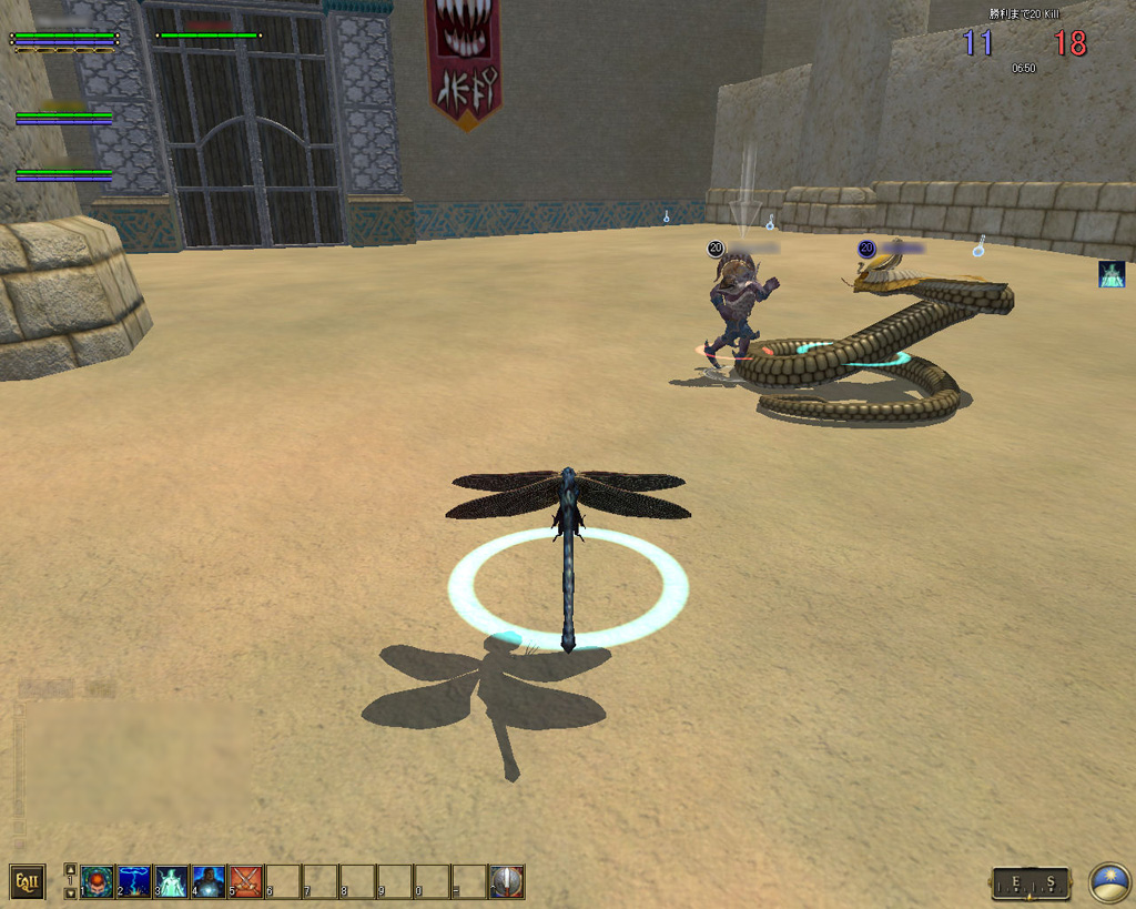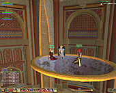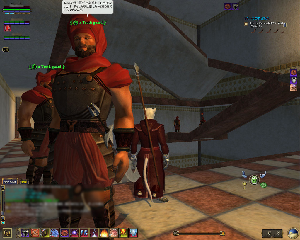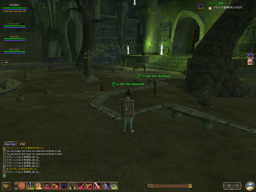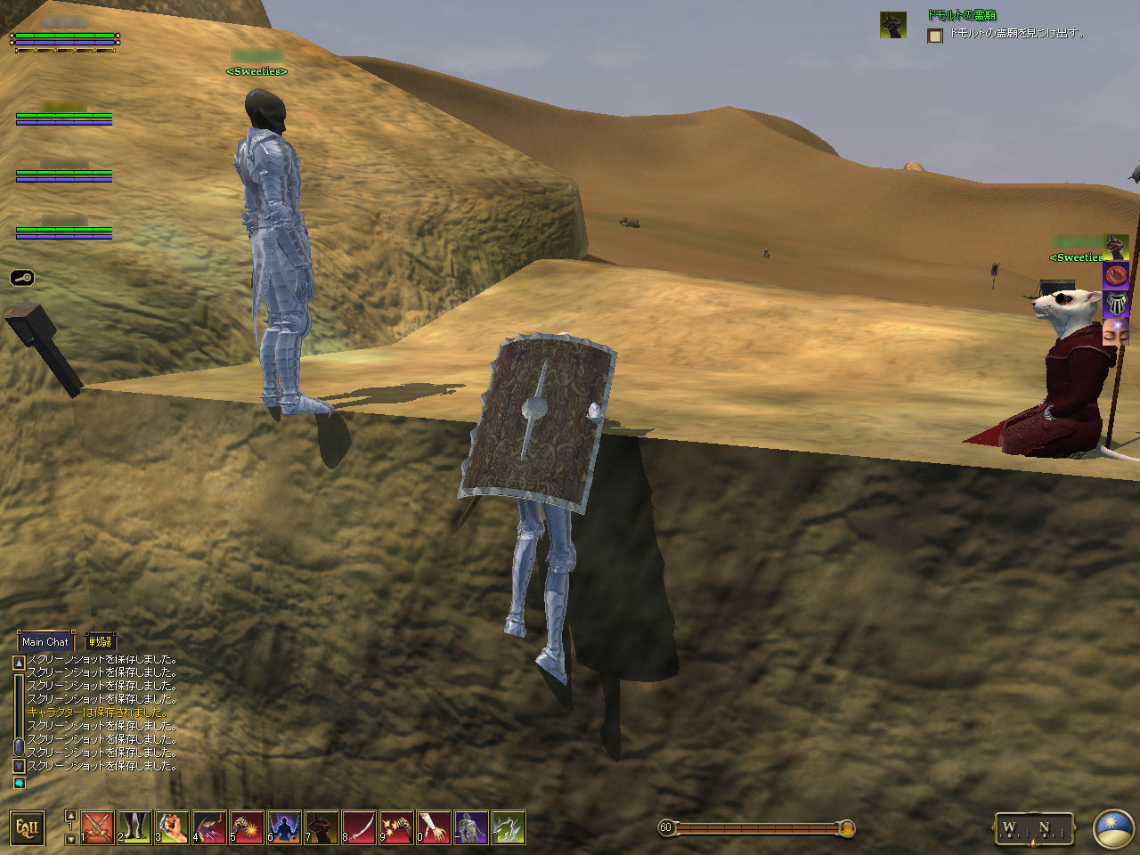 このテントには,さまざまな勢力のNPCが並んでいた。この世界へ新たに訪れる冒険者の勧誘合戦はもう始まっている,といった風情だ。ガイドの先導で進んでいくと,画面上にいま入った地域名が表示される。「マーのオアシス」! 前作「エバークエスト」(以下,EQ1)の経験者であればアレやコレやいろんなものを思い出さずにはいられない地名だ。この古い友人に久しぶりに出会えたような感覚が嬉しい。