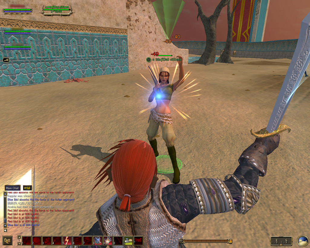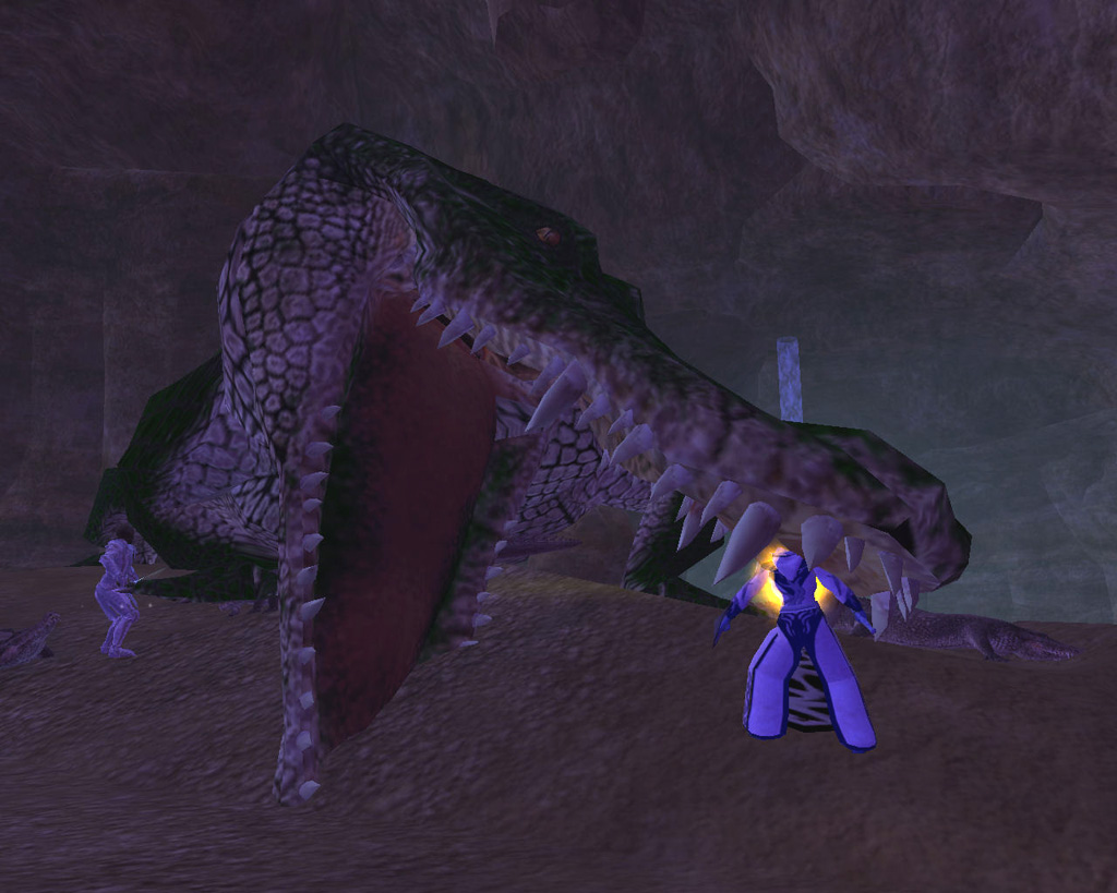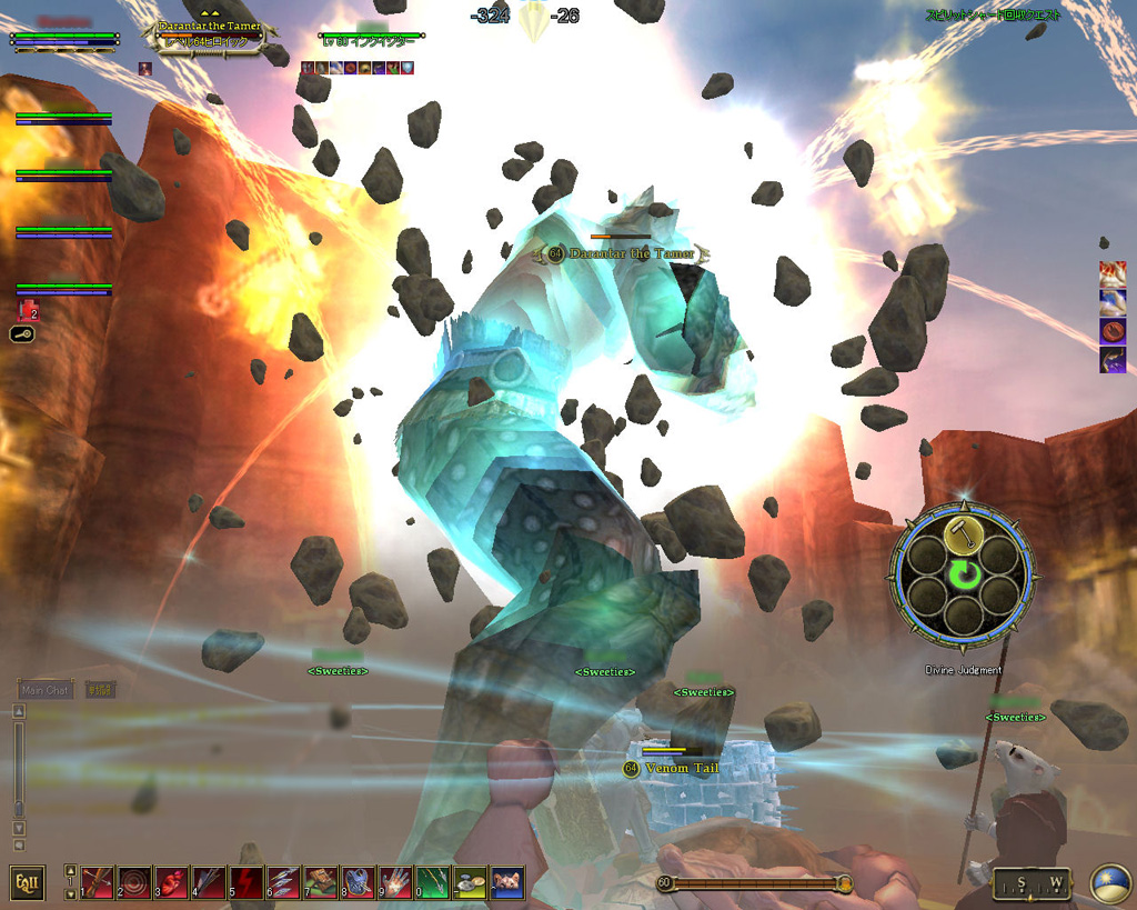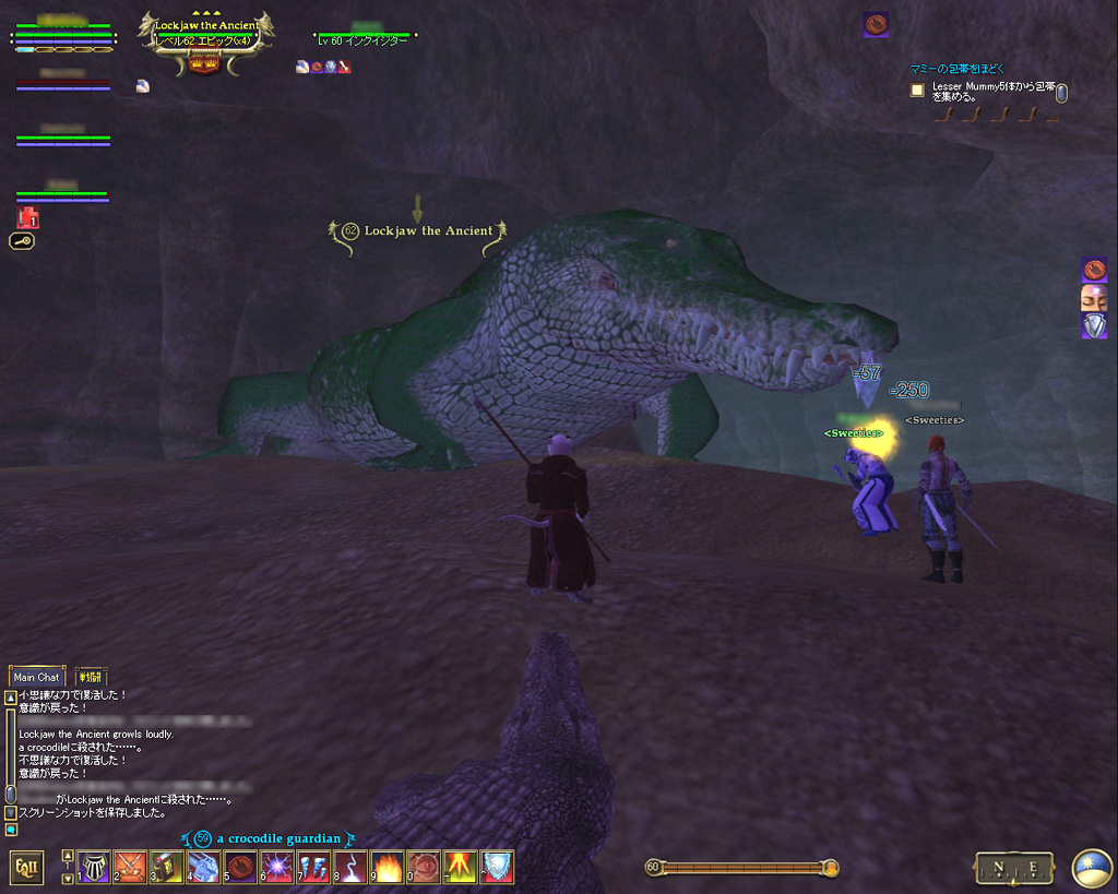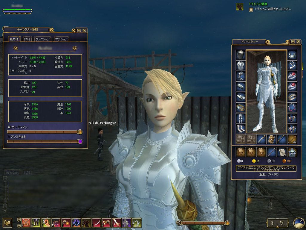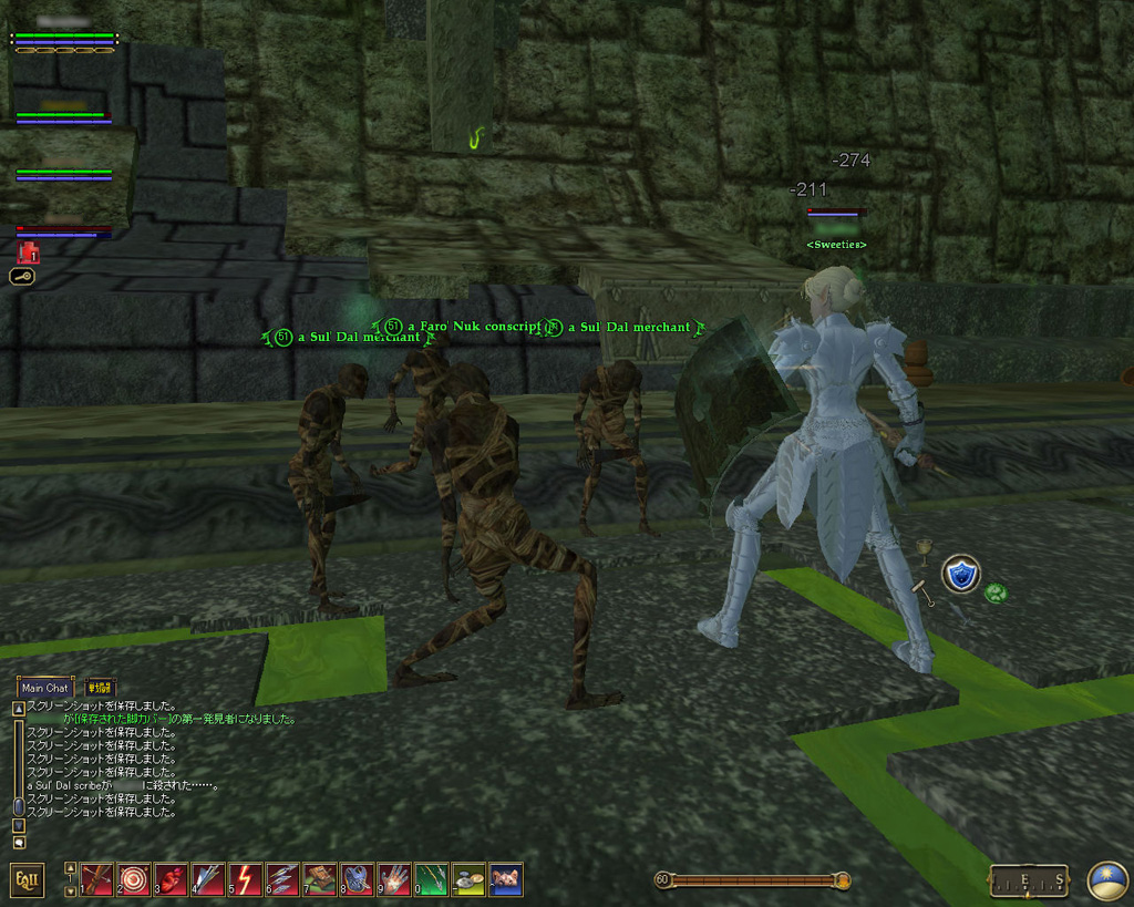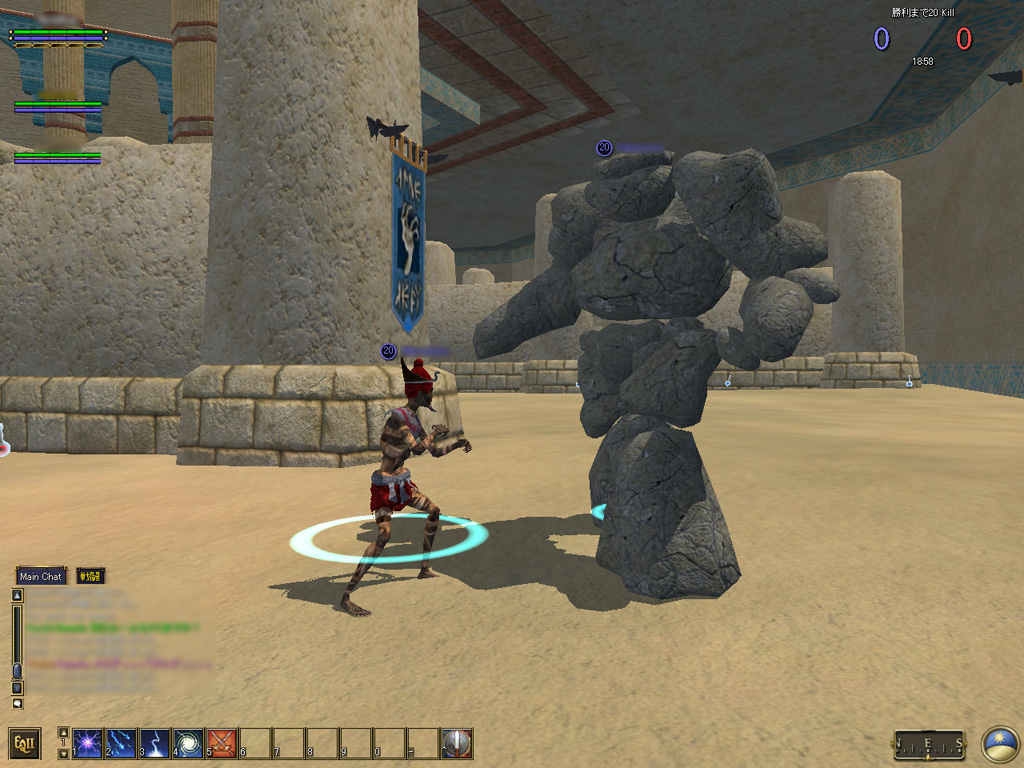 このテントには,さまざまな勢力のNPCが並んでいた。この世界へ新たに訪れる冒険者の勧誘合戦はもう始まっている,といった風情だ。ガイドの先導で進んでいくと,画面上にいま入った地域名が表示される。「マーのオアシス」! 前作「エバークエスト」(以下,EQ1)の経験者であればアレやコレやいろんなものを思い出さずにはいられない地名だ。この古い友人に久しぶりに出会えたような感覚が嬉しい。