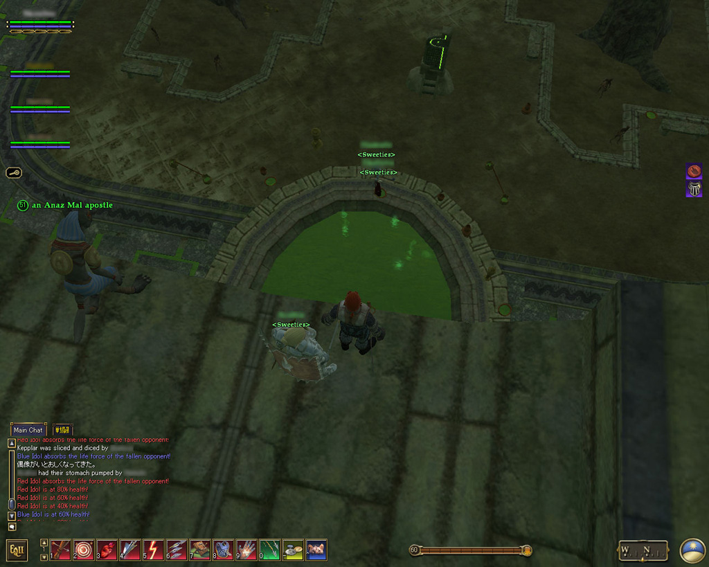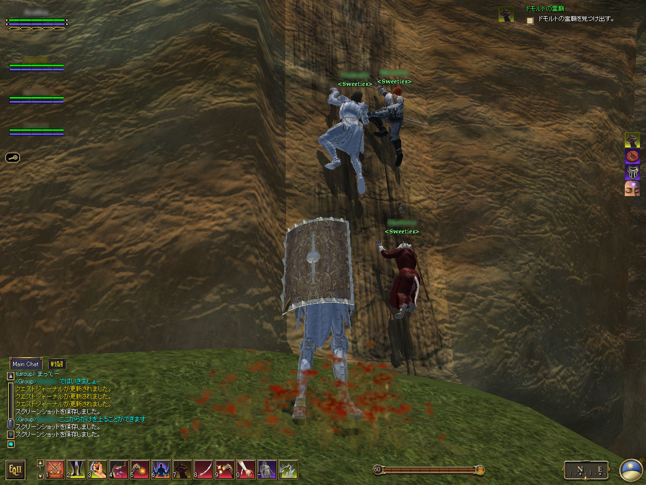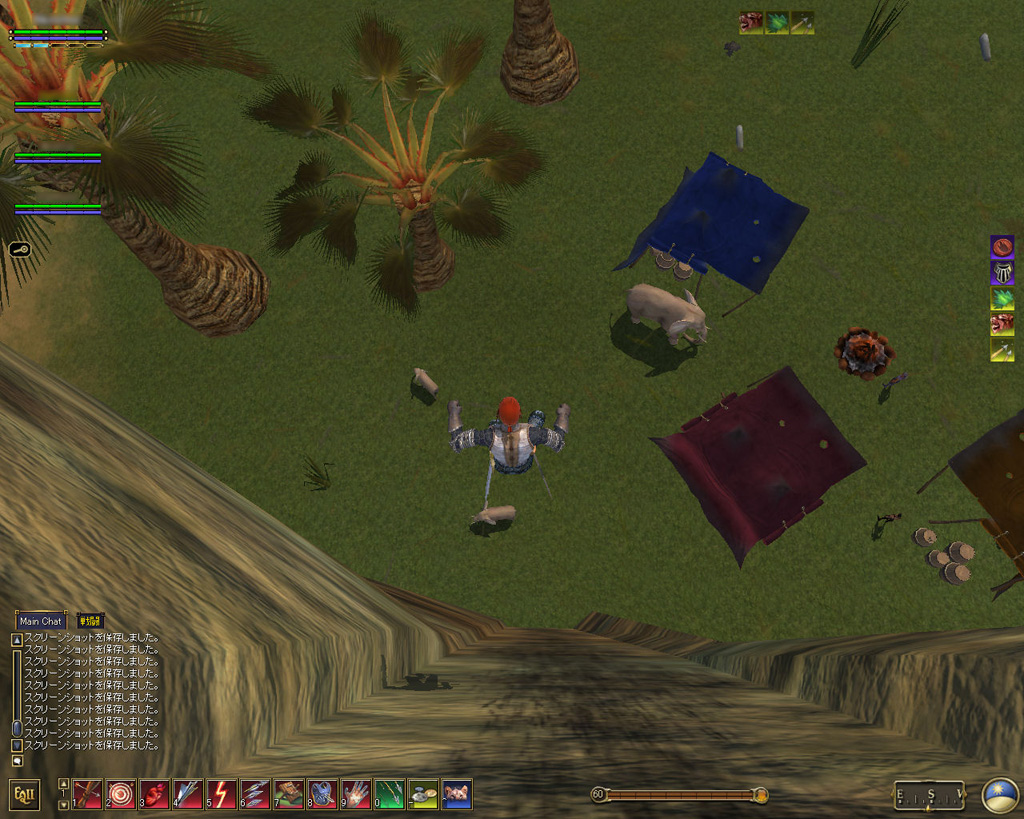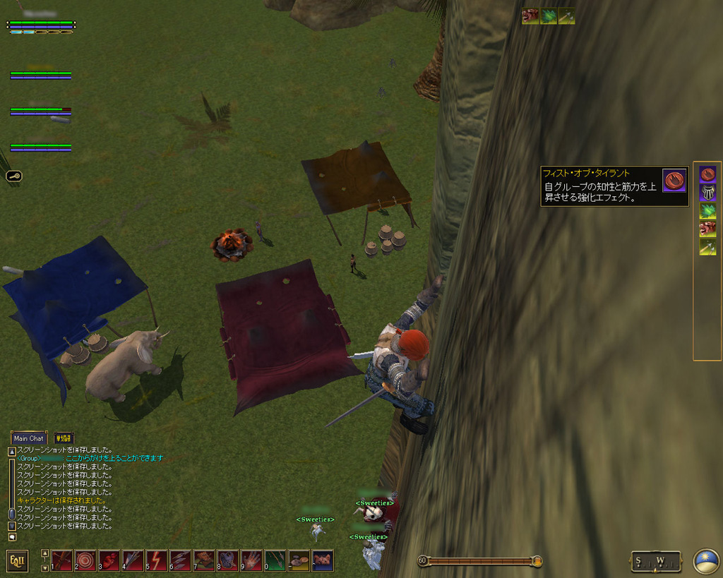壁に張り付いて登っていれば,飛び降りてみたくなるのが人情だ(?)。ガイドの制止を聞かずに,高所からぴょんと壁を離れて落下してみたら,当たり前だがダメージを受けた。ほかの二人も同じように飛び降りたが,高い「セーフフォール」のスキルを持つレンジャーはダメージをほとんど受けていないようだった。