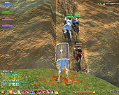 少し進むと,壁にひっかき傷のような跡があるガケのふもとに到着した。ここはDoF導入で可能になる「クライミング」が可能な場所だ。クライミングは,このような特定の場所でしかできないが,種族やクラスに関係なく,すべてのキャラクターが行える。クライミング可能な壁には,周囲とは少し異なるテクスチャが張られている場合が多く,それほど苦労することなく判別できるはずだ。DoFゾーンには,このように登っていかないと進入できない場所や,取得できないクエストがあるという。