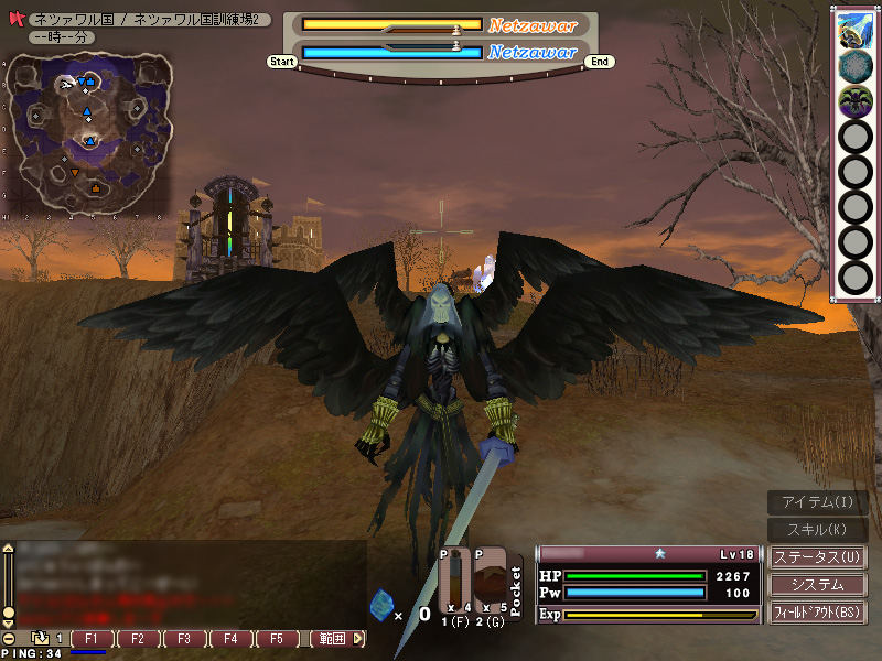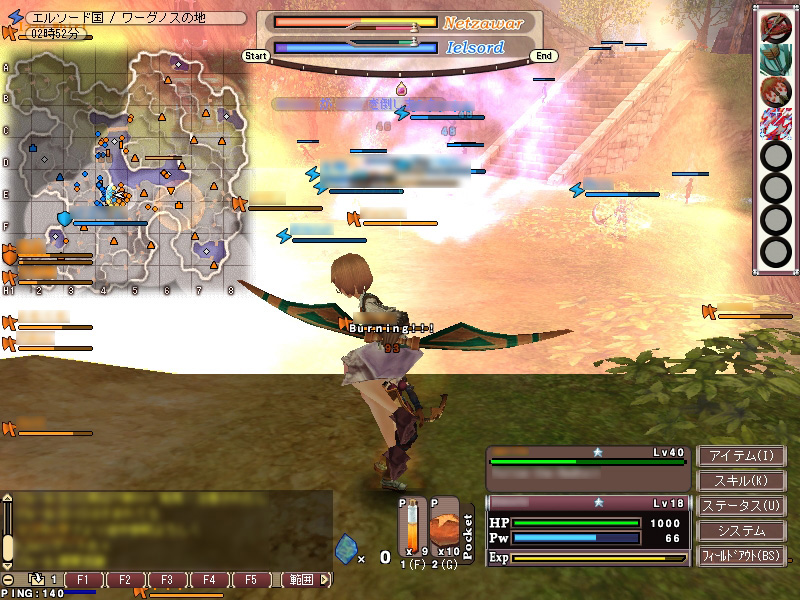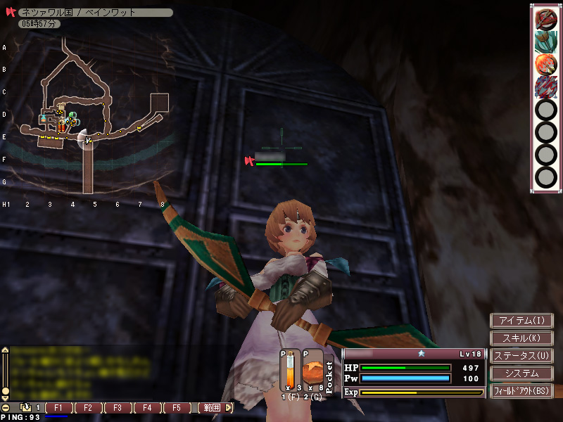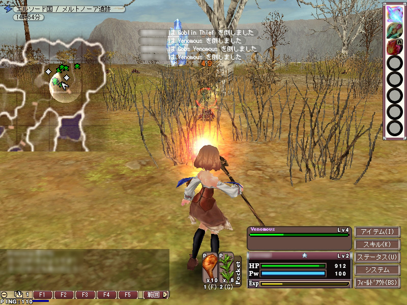 モンスターの中には,ときどき宝箱を落とすものがいる。宝箱の中には大抵“肉片”や“ハーブ”といった回復系のアイテムが入っている。これらはアイテムウィンドウから画面下のスロット(ポケット)にドラッグ&ドロップすることで,ボタン一つで使用できるようになる。これらを使ってHPを回復させながら戦えば,いつまでも戦い続けられるというわけだ。