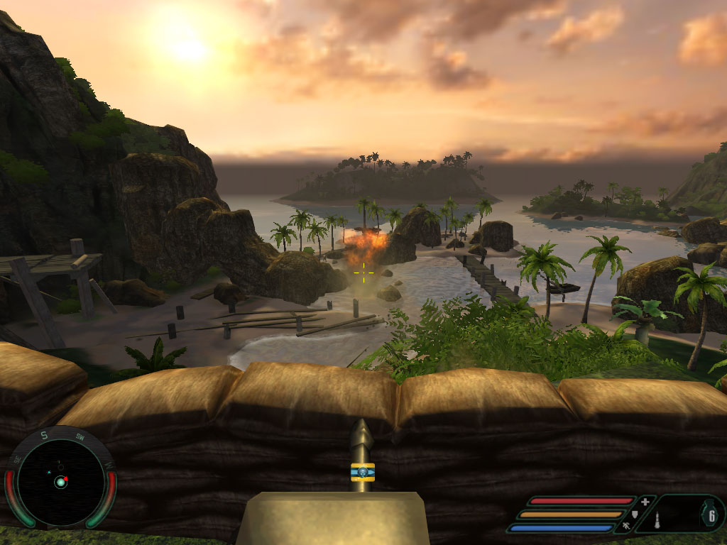 | 海岸線の兵士をトーチカの迫撃砲で一掃。この小高い丘には左右から敵が迫ってくるが,キチンと双眼鏡でマークしておけば,その都度ライフルに持ち替えて対処できる |