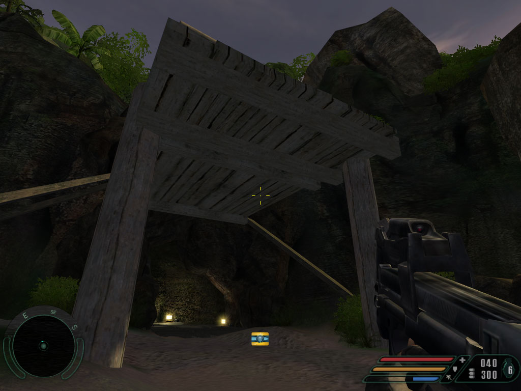 一方,最もオーソドックスだといえるのが,まずは海岸沿いの兵士キャンプ西側に位置する丘へと進む方法だろう。ここにはアーマーとヘルス回復アイテムがあって,レベル開始地点の左手からぐるりと弧を描くように移動すれば,歩哨2,3人程度との遭遇で辿り着くことができる(チェックポイントもあるし,きっとこれが正攻法なのだろう)。