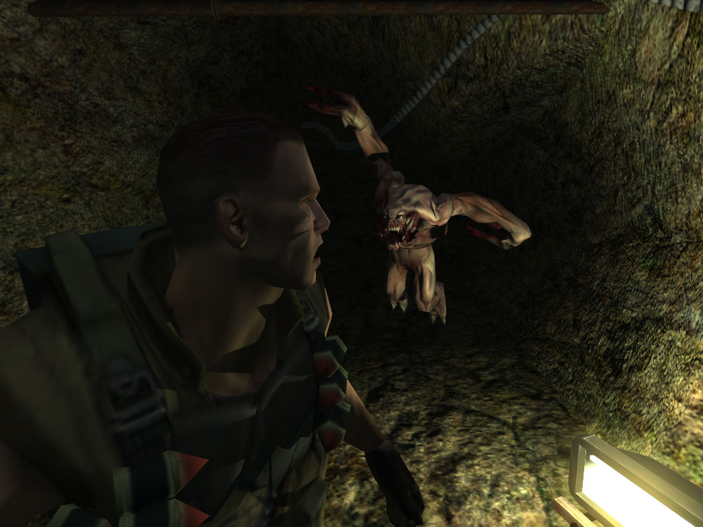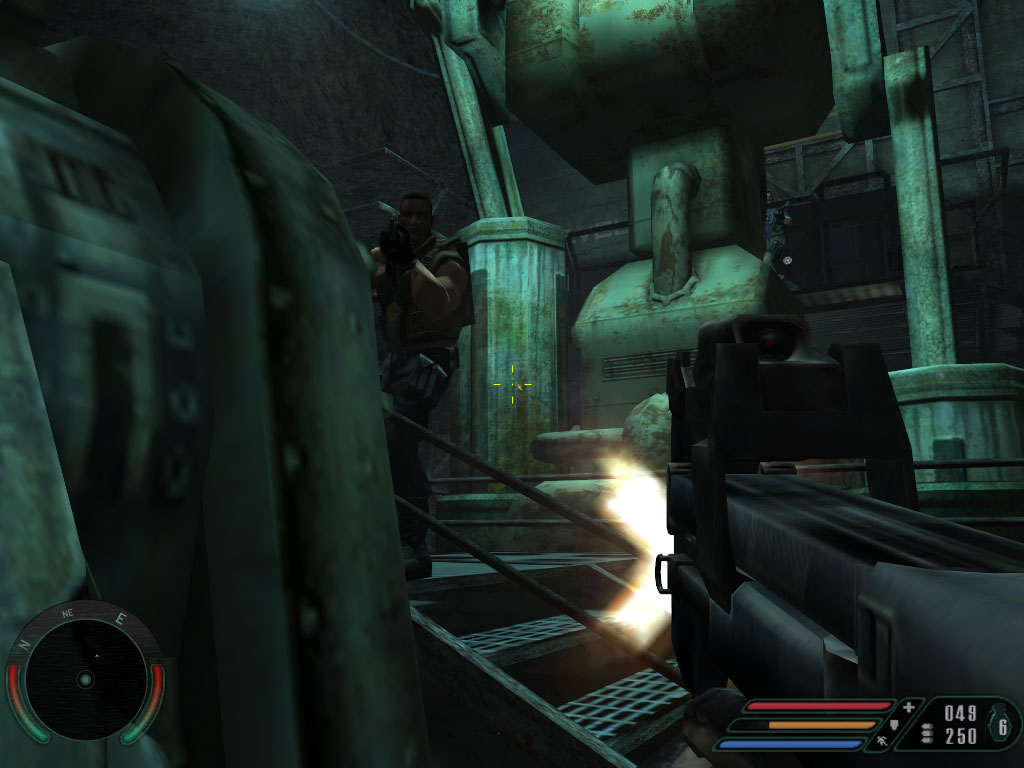 一番スムースにいったのは,まず左手へ少し進んで2〜3人の兵士を射殺。そのあと右方向へゴリゴリ進んでスイッチON,そして連絡通路を抜ける方法だ。この方法だと,エレベーター前の兵士がこぞって分岐点を右方向にジャックを追いかけてくるので,連絡通路を通ったあとのエレベーター前はモヌケの空。エレベーターに乗ってしまえばすべてやり過ごせる。