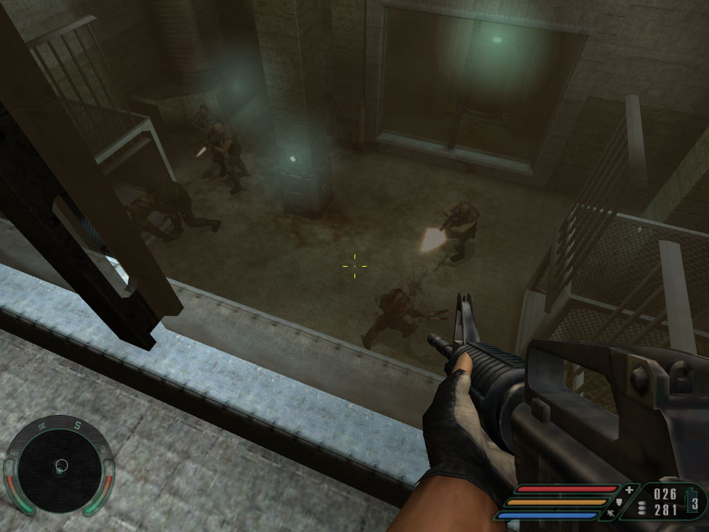 オススメは,エレベーターを降りた直後の部屋の右側にある下り階段から進むルート。ここなら,次の部屋へ侵入するときに兵士に気付かれることなく手榴弾を投げ込むことができるし,階段の上や下といった縦方向の射撃を行うことが少なくて済む。