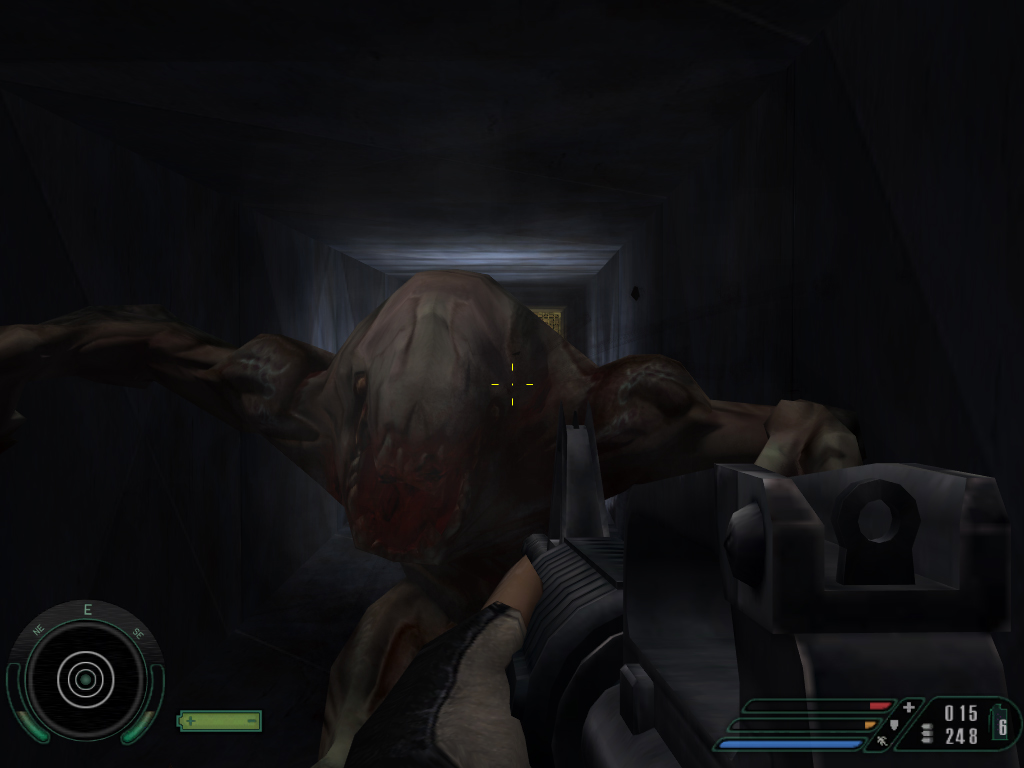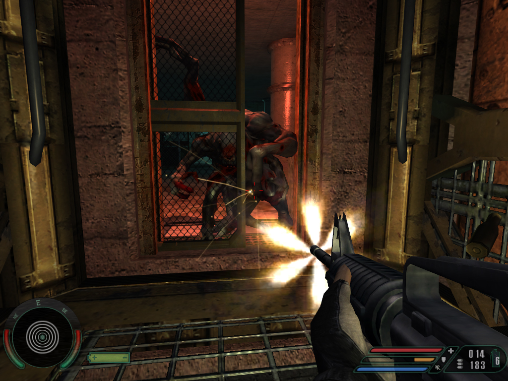 ここは基本的にCQBなため,ただでさえ強力なトライジェンとの遭遇距離もグッと縮まる。元々トライジェンとの戦闘では(3秒ぐらいで死ぬから)接近戦はご法度で,通路を逆戻りしたりしながら距離をとるのが基本。屋内のみ,しかも細い通路だらけの本レベルでは,あっちへ隠れてこっちへ隠れてと,実際のボリュームとは裏腹に随分とプレイ時間が長くなる。