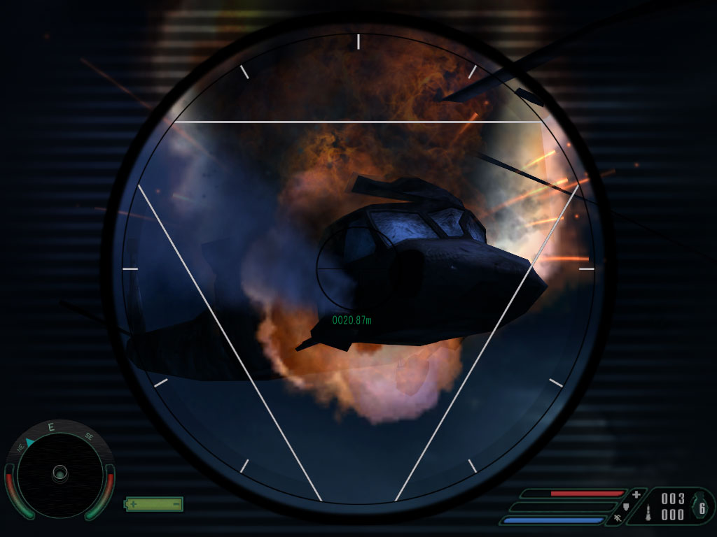 ちなみに屋外へ出た直後に遭遇する激しい戦闘だが,これはある程度難度を軽減できる。外に出るドアを開けたら,一旦屋内へと戻ってしばらく敵兵士とトライジェンが潰し合うのを待つのだ(左下のレーダーで銃声をモニターするといい)。5分ほどしてからあらためて外に出てみると,少なくとも兵士(人間)は一掃されているハズだ。
