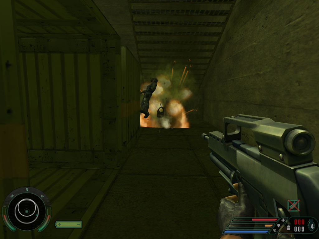 | 二度ほど通過するコンテナ倉庫では,四方八方からエリートガードが押し寄せてくる。マップ上のちょっとしたギミックを利用して,うまくアイテムを取得しよう |
