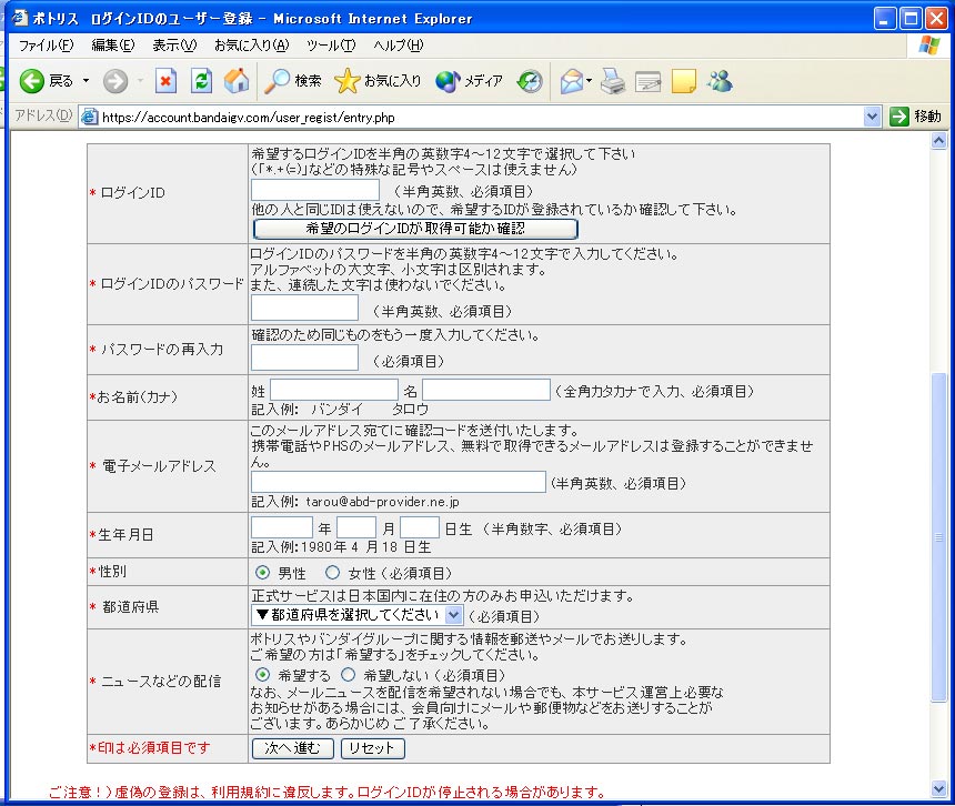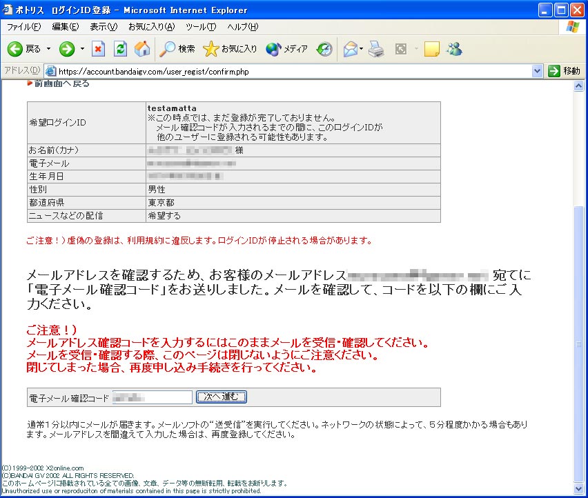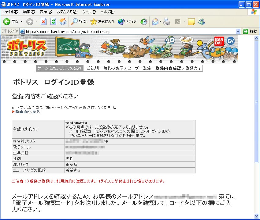 ログインIDは「こちら」のフォームに必要事項を記入するだけ(写真左)。画面下の「次へ」を押すと「ポトリス ログインIDの登録」(写真中央)と表示されるが,ここでブラウザを閉じないように。実はまだ登録は終了していないのだ。先ほどフォームにメールアドレスを記入したと思うが,そのアドレスに"メール確認コード"が送られてくる。それを"電子メール確認コード"の欄に記入する(写真右)。これでログインIDの登録が終了だ。あとはゲーム画面でログインIDを入力すればゲームが楽しめるというわけだ。