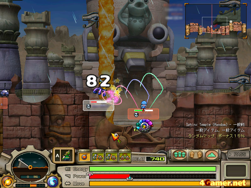 今回のタンクの中では,一番技術を要するタンクといってもいいだろう。発射角度のレンジが狭いので,効率よい攻撃を行なうには斜面などを上手に利用しなければならない。第一武器はヒマワリのような光弾を撃ち出すエネルギー弾。基本はこれで押していくことになるが,このタンクの最大の特徴は第二武器の蓄積エネルギー弾だ。これは攻撃をパス(F5キー)することでエネルギーを蓄積し,より強力な一撃を撃ち出すことができる。蓄積エネルギー弾は,三段階のパワーアップが可能で,パワーアップしていると砲弾のグラフィックスも変化する。ちなみに最強の状態は白色で太いビームになる。