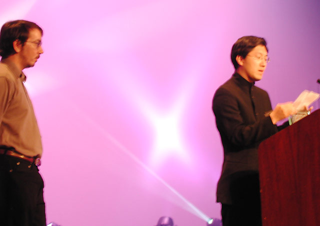 Achievement Awardを受賞。英語でのスピーチも卒なくこなした。プレゼンターは,1回めの受賞者であるウィル・ライト(Will Wright)氏だ |
