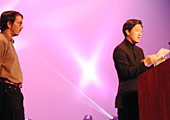 世界へ初舞台を踏んだのは,「ICO」のゲームデザイナーであるSCEの上田文人氏。「ICO」は,キャラクターの感情的な結び付きや,映画のようなダイナミックなカメラの動きが欧米では高く評価されている。今回のGDCでも,新世代のゲームデザインのサンプルとして取りあげられることも多い |