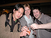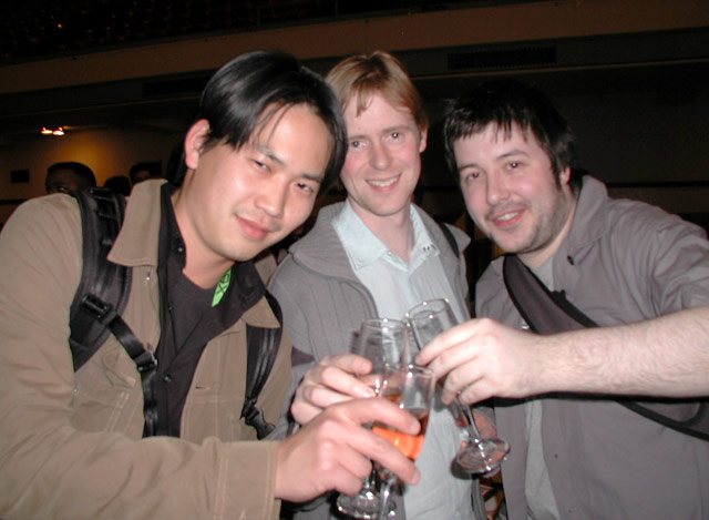 楽しげにシャンペンで祝杯をあげるDMA Designsのメンバー。アメリカではPS2版が大ヒットしており,アメリカでは5月にRockstar