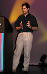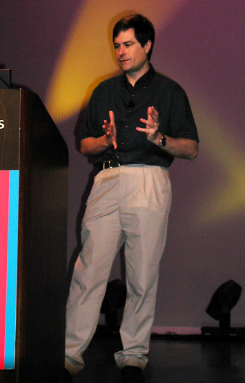 今後の5年間で技術はどのように変わっていくのか,どこに目を向けてゲーム開発を行っていくべきか,という大胆な予想をプログラマの立場から予想するのは,1980年代初期から活躍するブレイベン氏。映画産業の生い立ちと比較して,少なくても今後10年は技術的な進化が猛スピードで行われていくはずだと予測した。これは,ムーアの法則に基づくIntel社の予測や,ソニーがプレイステーション3はPS2の1000倍の能力となると豪語していることから察する"技術革新の余地の大きさ"から推測された期間である。