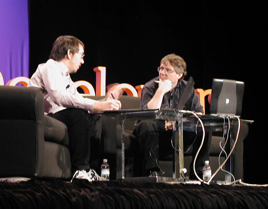 ウィル・ライト(左)&スコット・マクラウド(右) ウィル・ライト氏の手掛けた「シムピープル」は,発売3年めに入った現在でもセールストップ10の上位に居座り続けている。最近ではIGDAだけでなく,AIAS(全米インタラクティブ芸術科学学会)からも"ゲーム業界の殿堂"と評されている。またマクラウド氏は,コミック作家だけでなく,11歳で世界チェスチャンピオンになるなど,多才な人である |