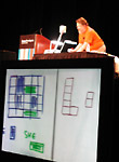 数学者のコンウェイ博士を有名にしたのは,彼が発案した「ライフゲーム」という数字遊びだ。ライフゲームは,生物の集団の繁栄や衰退を極度に簡素化したもので,コンピュータの理論モデルになっているともいわれている。日本に旅行した際に"イズミ"という女性に説明してもらったという紙と鉛筆を使ったゲームを紹介して,会場のボランティアと対戦。10戦10勝となった理由から,その簡単なゲームの中に潜む理論を暗示した。