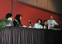 オンラインゲームの開発者として名高い業界人が集まって,今後のMMORPGに必要なゲームデザインを討論。Electronic Arts社でオンラインゲーム部門を統括するワルトン氏を中心に,「Star Wars Galaxies」のラフ・コスター氏,「リネージュ」のジェイク・ソン氏,「Middle-Earth Online」を開発中のジェシカ・ミューリガン氏らが集まった。