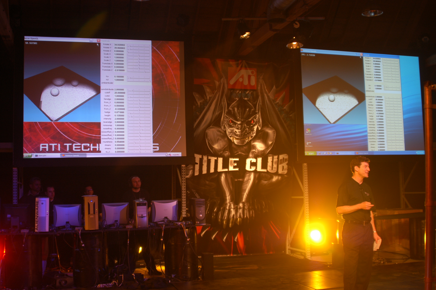 | 新RADEONの発表会では,長いピクセルシェーダプログラムを実行して,NVIDIA社製某GPUとのフレームレート比較を見せた |