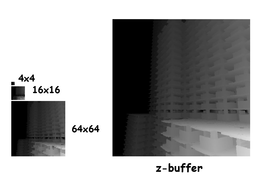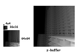 | 大元のZバッファを4×4単位で見て,その代表値から1/4サイズの縮小型Zバッファを作成。さらに2×2単位で見てその代表値からさらに1/4サイズの縮小型Zバッファを作成する。例えば1024×768ドットの場合,縮小型Zバッファのサイズは256×192ドット 64×48ドットになる。64×48ドットの縮小型Zバッファは,容量的にはたかだか12KBなので,オンキャッシュ動作できる……というわけ |