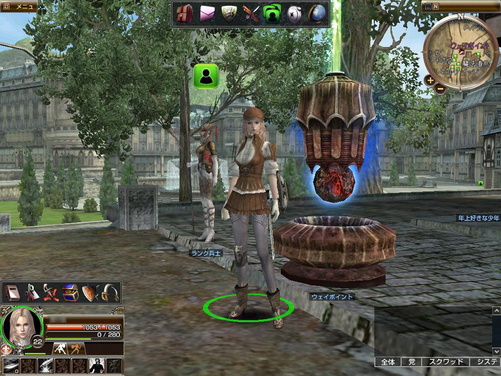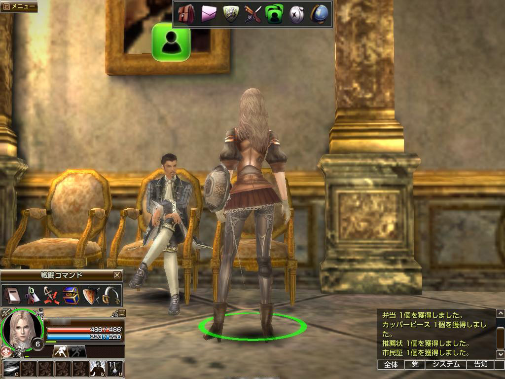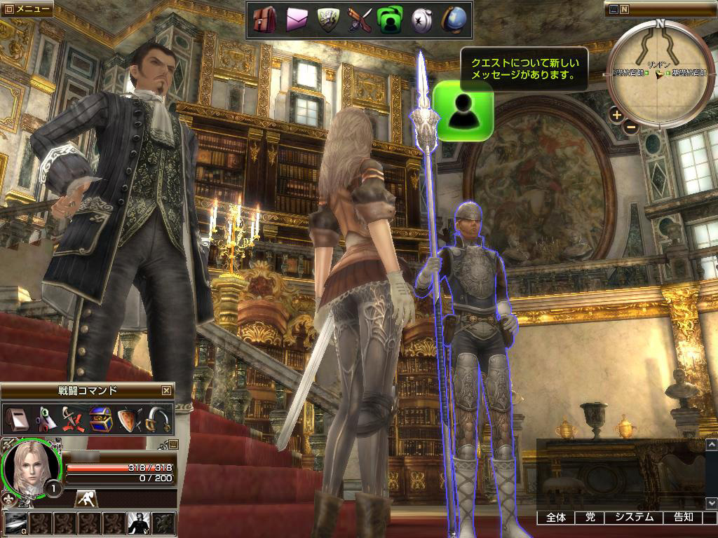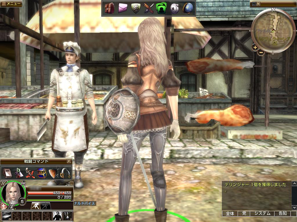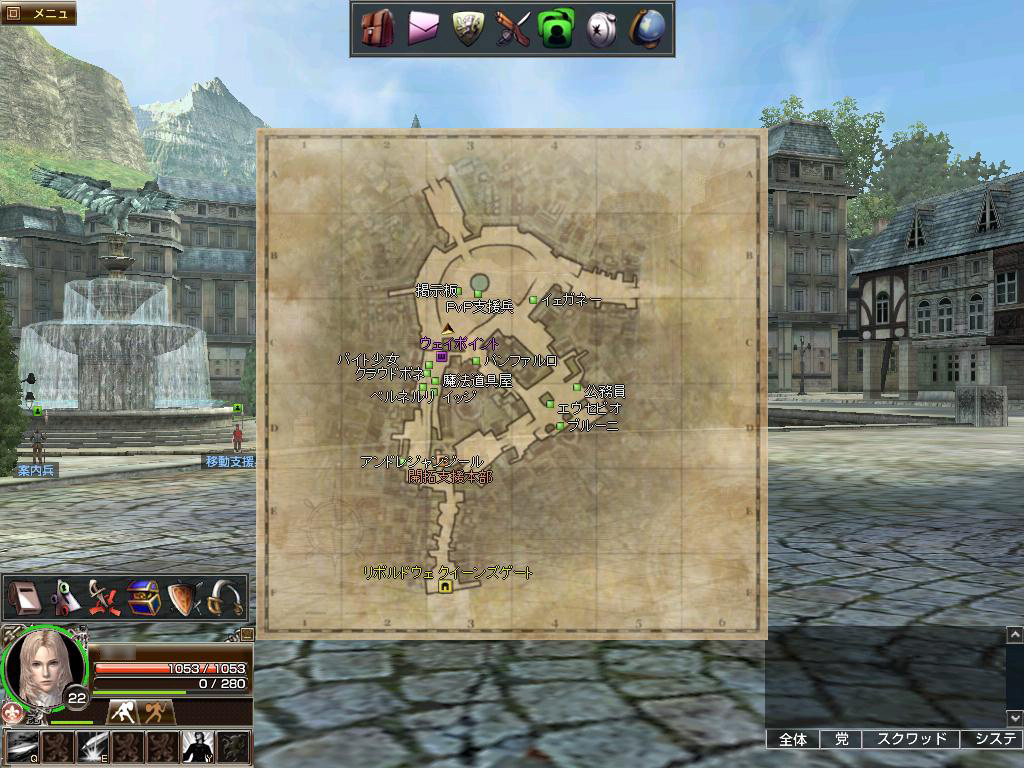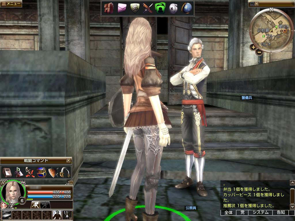 支援本部中央にいるヒゲのおじさんリンドンに話しかけると,まずは街の人々と話しかけるのに慣れること,そして武器商店のクラウドボネに話しかけることを勧められる。後者は,初のクエストだ。Alt+Aキーでクエスト情報ウィンドウを開き,自分のやるべきことと,その報酬を確認しておこう。