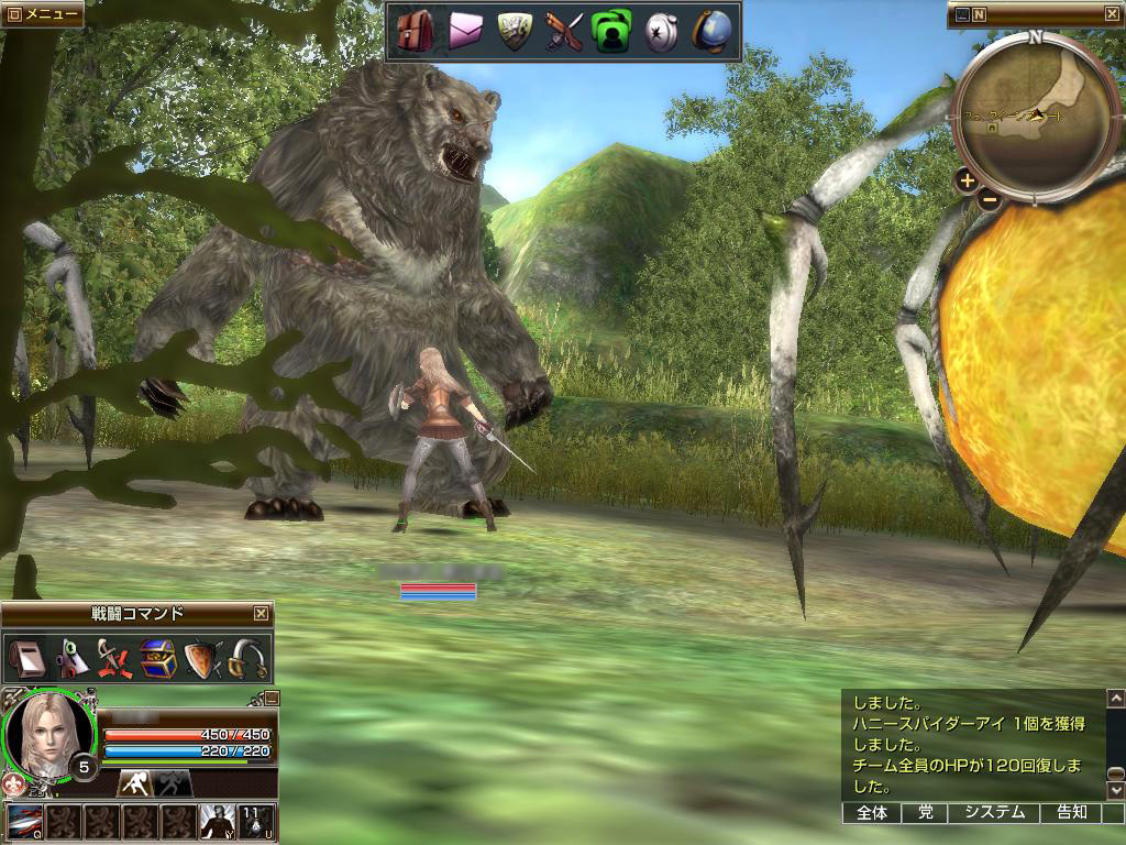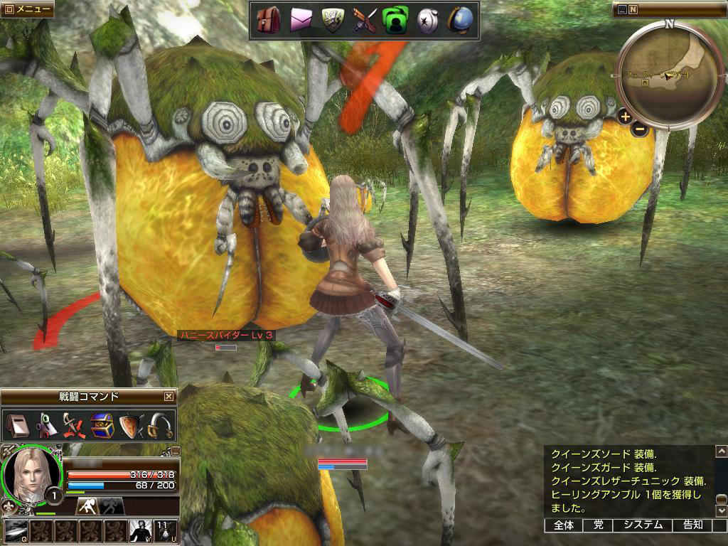 ここにいるのは,「ハニースパイダー」や「ハニースパイダーミニオン」といった弱めのモンスター。戦闘は,敵をクリックすれば自動で始まる。ハニースパイダーなどはやや大きくてグロテスクだが,初期のどの職業でも,数回攻撃すれば倒せるので,恐がらずにザックザックと狩るべし。