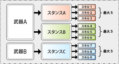 最初は少し分かりにくいかもしれないが,GEではキャラクターの装備する武器によって使えるスタンスが絞られ,スタンスを決めることによって使えるスキルが絞られる。以下の図で,だいたいの仕組みをつかんでおいてほしい。